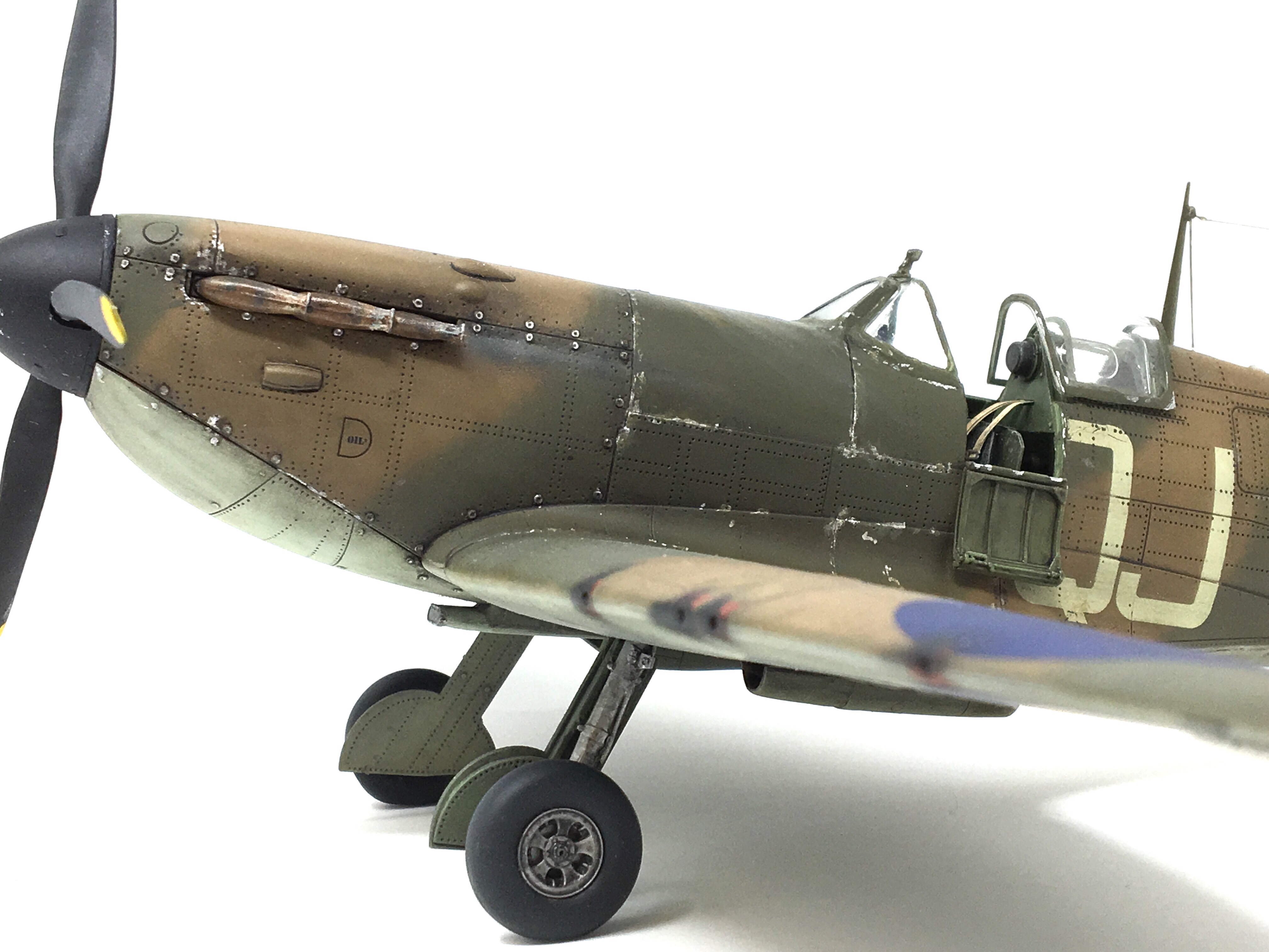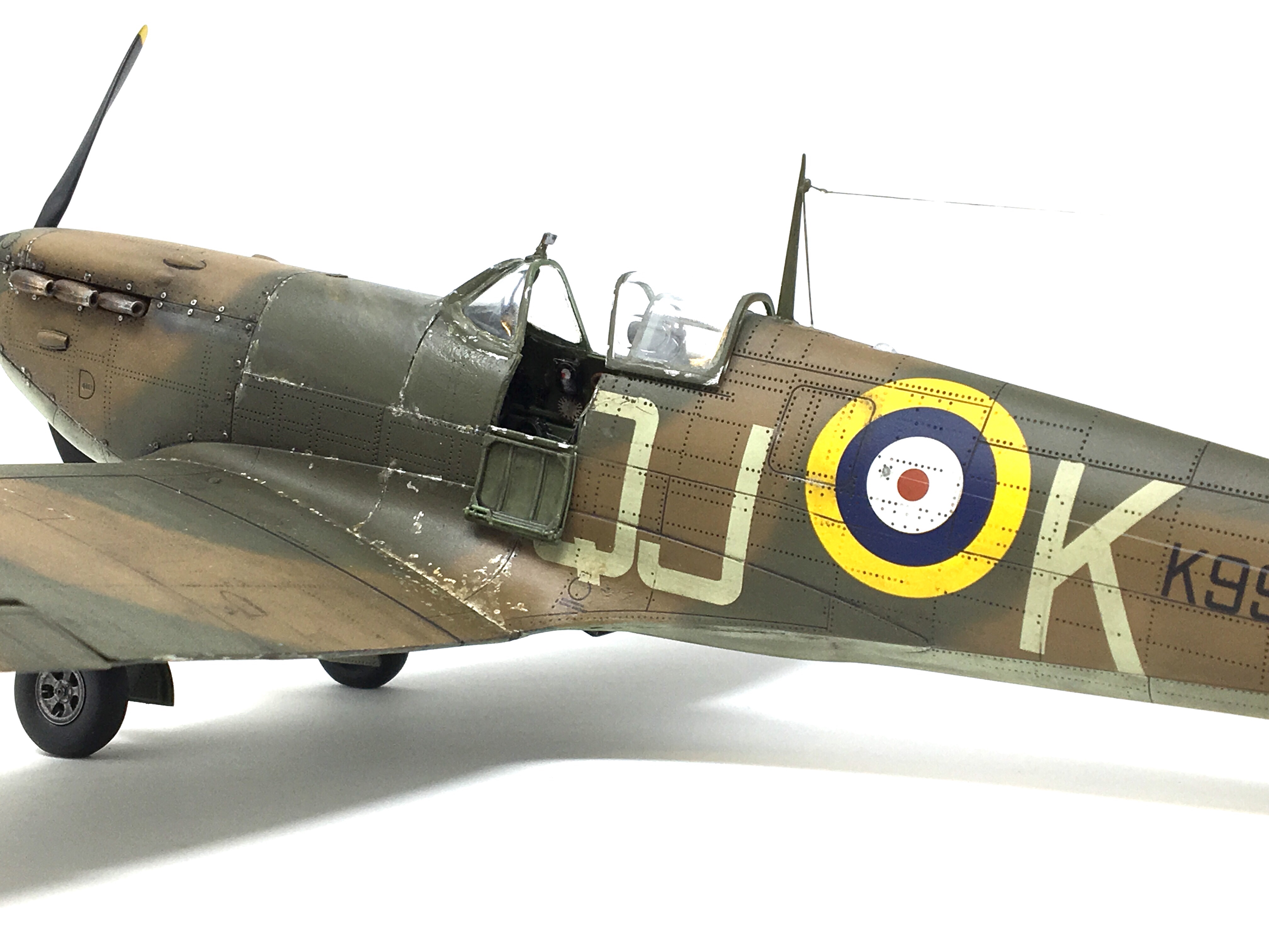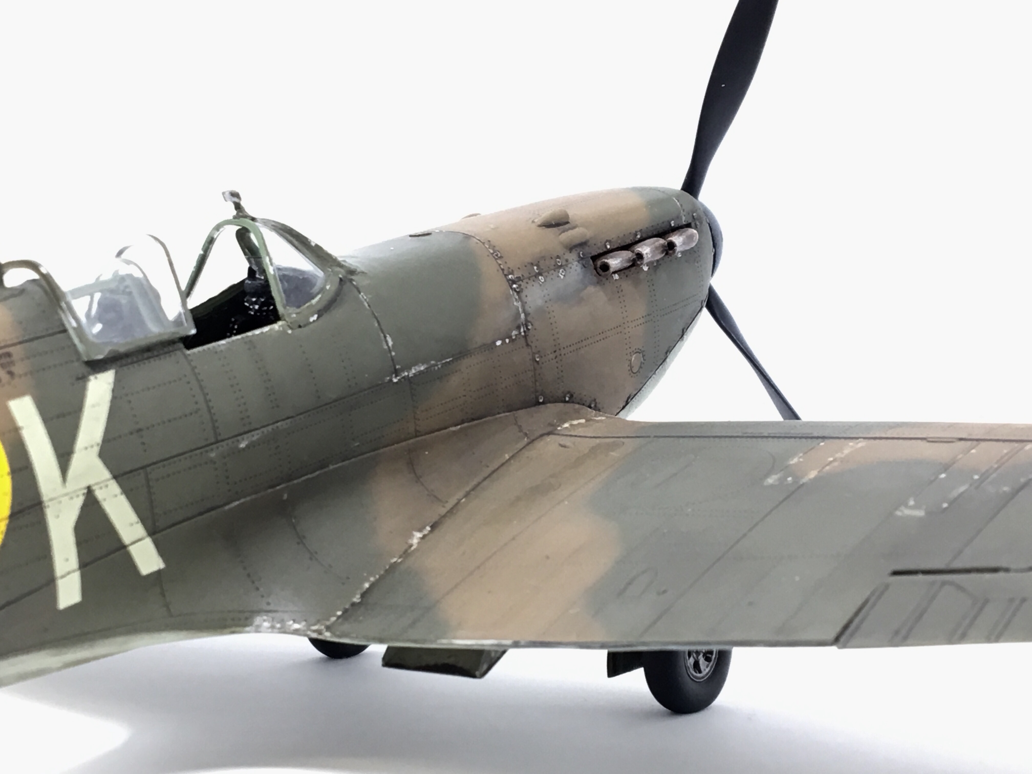 This is Revell’s 1/32 Spitfire Mk.IIA backdated to Mk.Ia configuration and enhanced with Barracuda Studio’s resin parts and Eduard Photo-etch detail parts. Painted with Tamiya and Grunze Acrylic’s and weathered with AK Interactive’s Aircraft weathering washes.