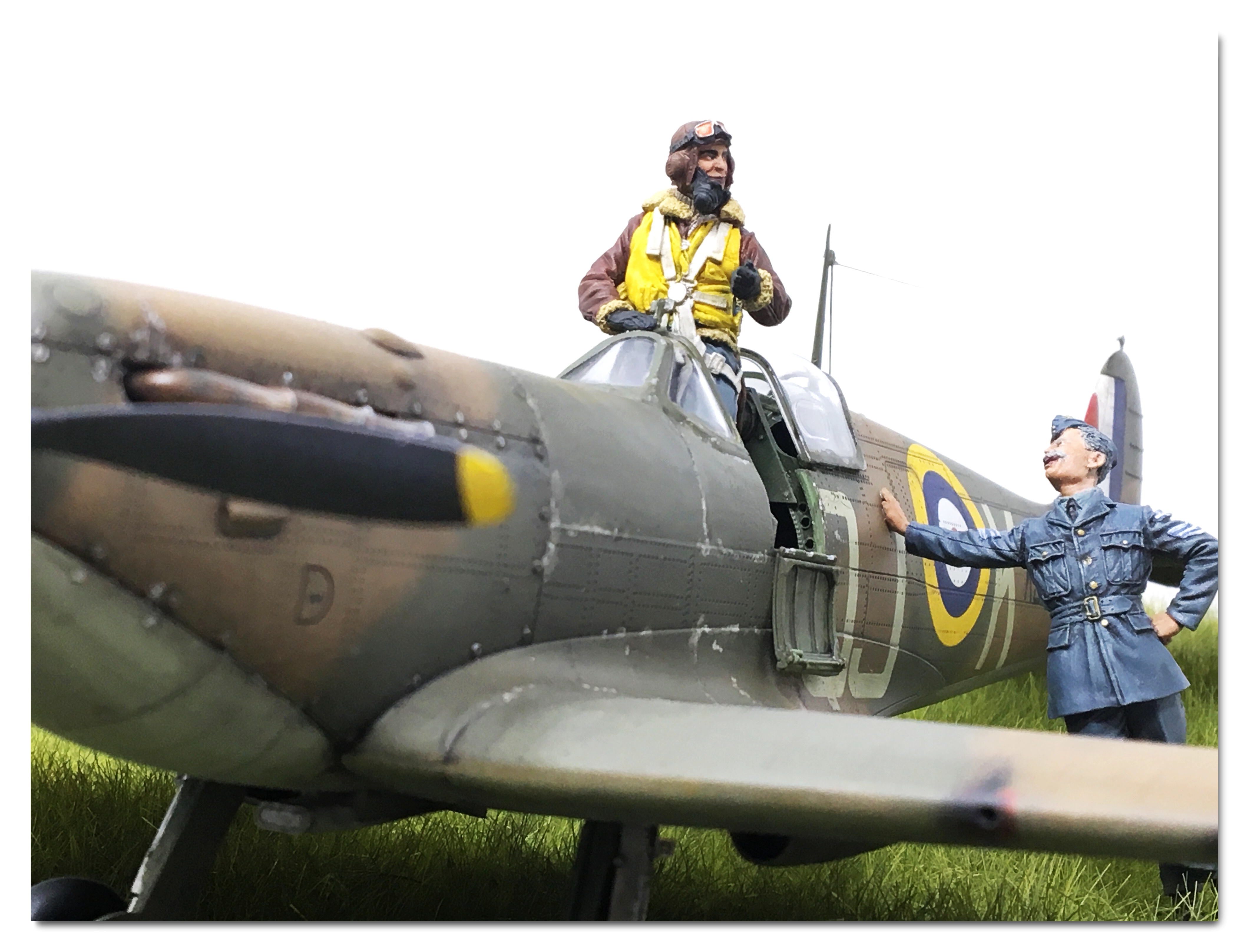 In my last post we saw the completion of my commission build Spitfire, Geoffrey Wellum’s K9998. Now the Spitfire has been enhanced by posing it in a typical scene from the Battle of Britain-A lone Spitfire Mk.Ia with its pilot being greeted by the venerable RAF Flight Sgt.