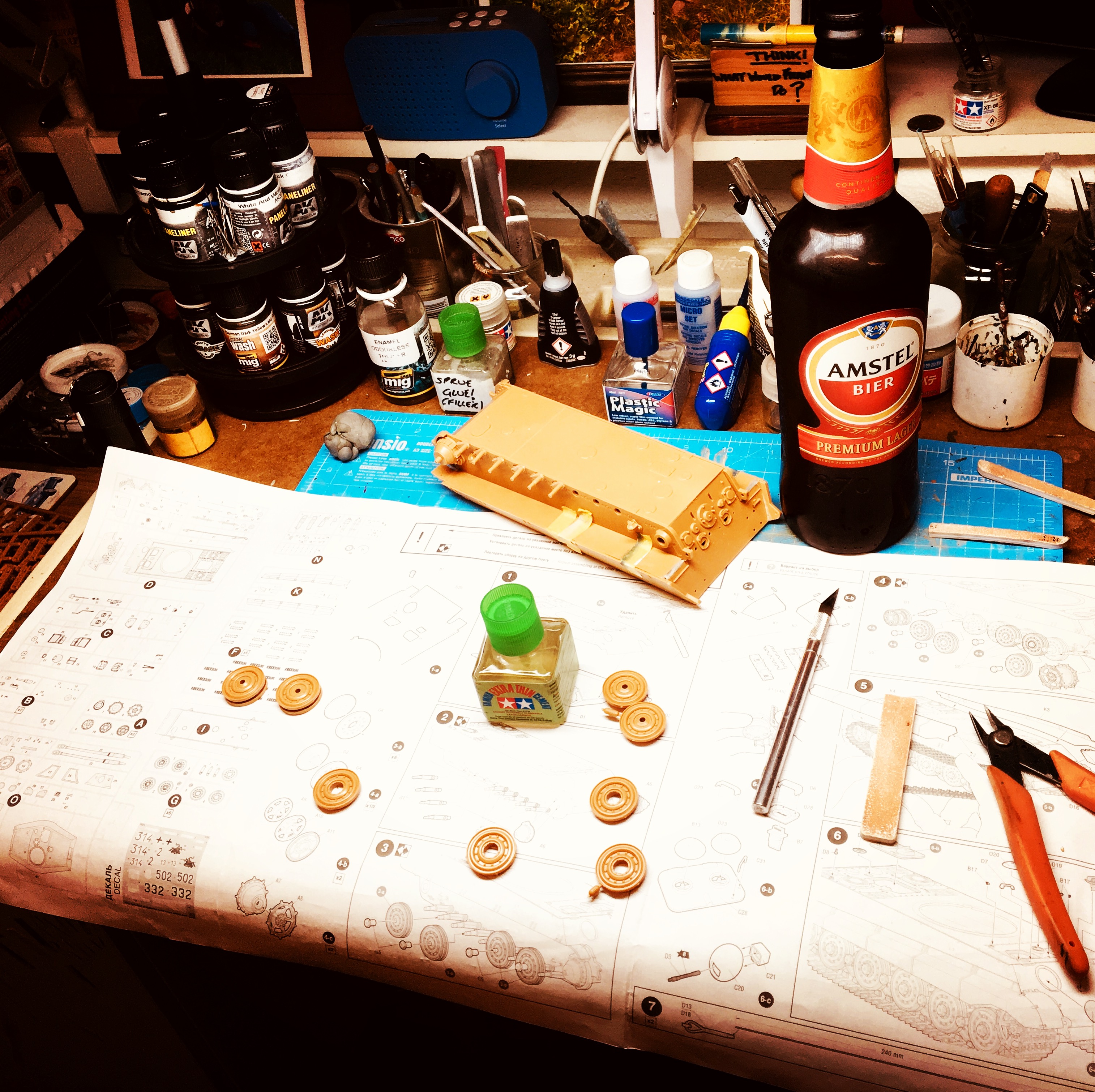 Upon opening the box I found a Kingtiger without Zimmermit but a model with individual track links and a decent level of detail. Before I knew it, I had cracked open a beer and was working on this model!