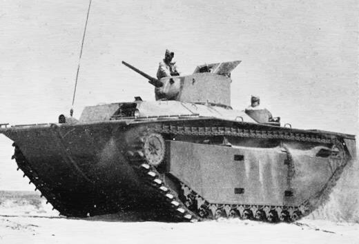 LVT(A)-1 :The first infantry support LVT. With the first experience of Pacific amphibious operations it was clear heavier firepower than the usual .50 in guns was needed. Based on the LVT-2, A standing for armored, this fire support version had an armored (6 to 12 mm) hull. It was fitted with a turret nearly identical to that of the Light Tank M3, with a 37 mm Gun M6 in an M44 mount, and also carried two rear-mounted machine guns, 509 units were produced. The vehicle’s hull was covered in 6-12mm of armor plate, and the vehicle was powered by a 262 bhp (195 kW) air-cooled petrol engine. Despite the limitations imposed by the turret, it could still carry a limited payload of 1,000 lb (450 kg) of cargo and had a quite respectable speed of 25 mph (40 km/h) on land and 6.5 mph (10.5 km/h) in water, and an operational range of 125 mi (200 km) on land or 75 mi (120 km) in water.