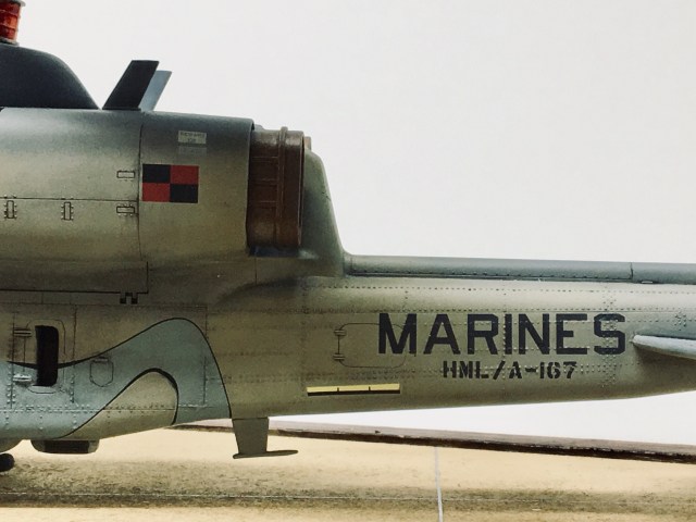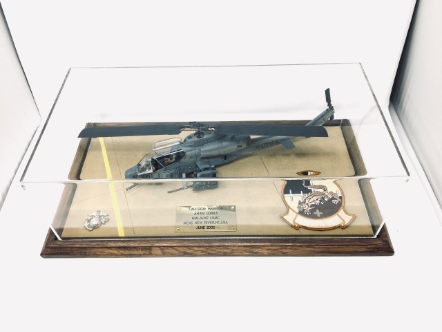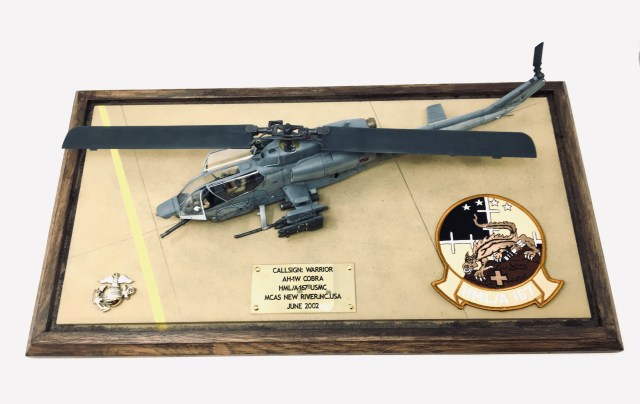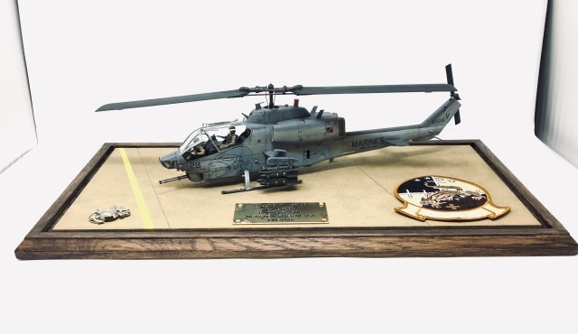Here the model is displayed with US Marine’s Officer Cap Badge, Plaque and Squadron Patch of HML/A-167.