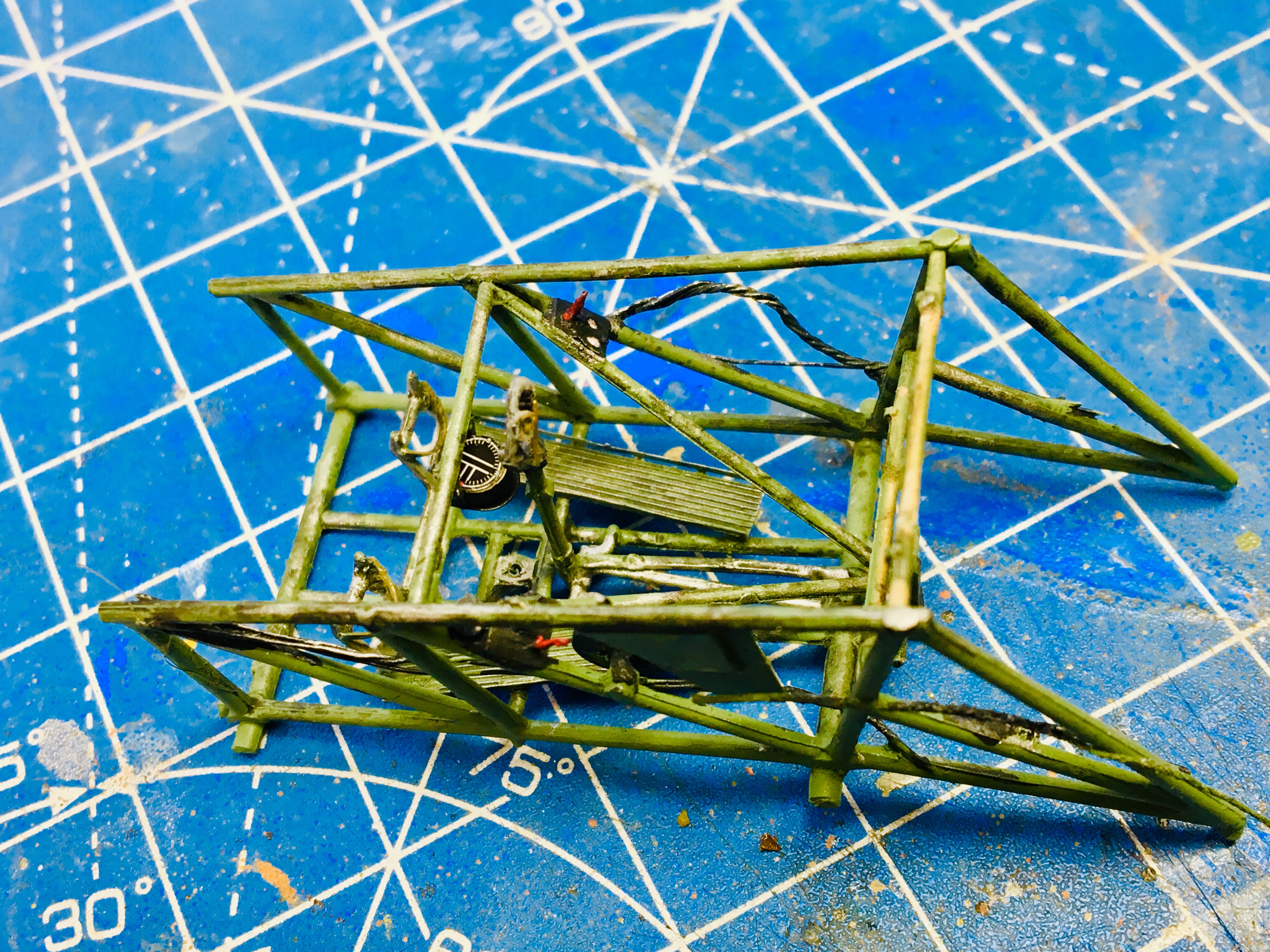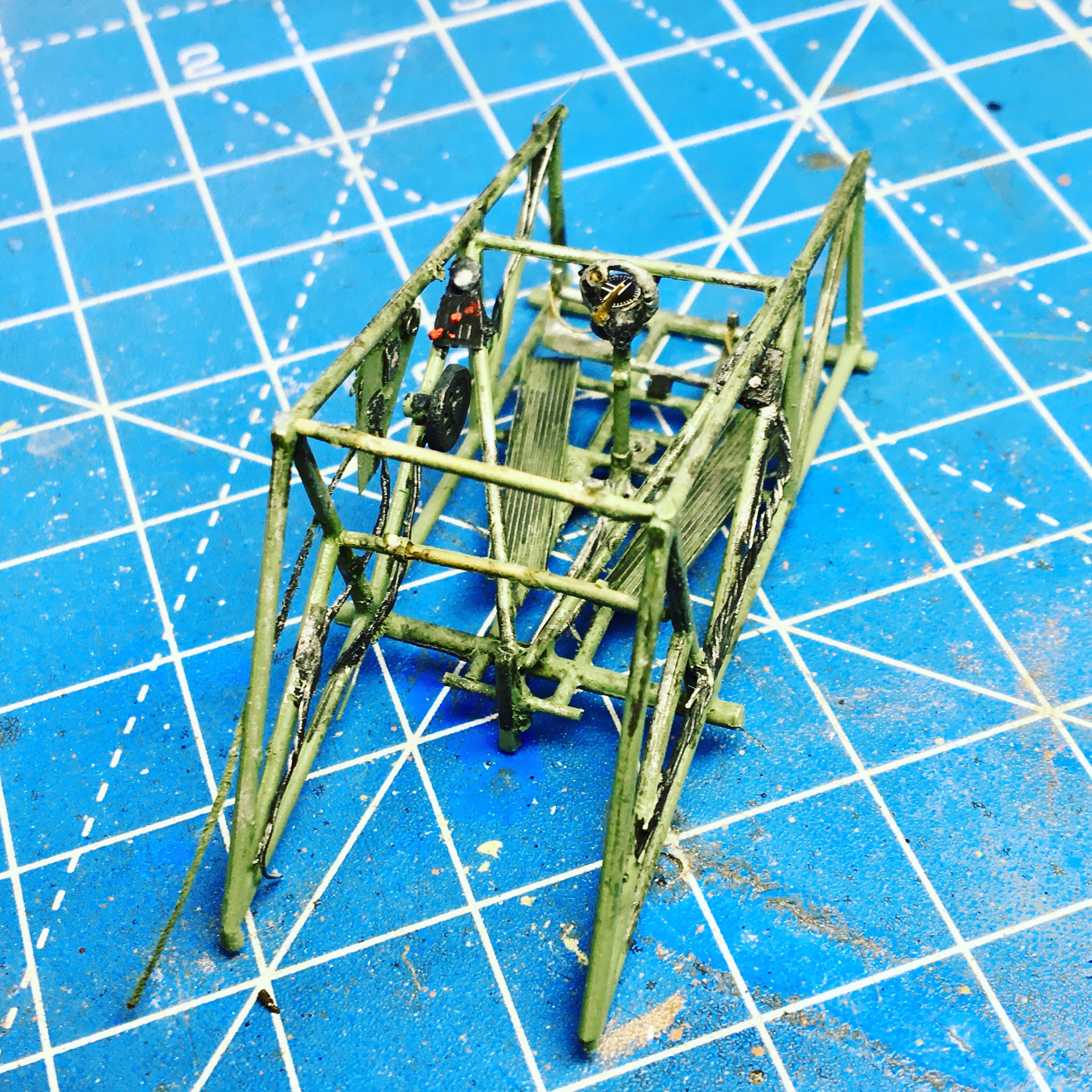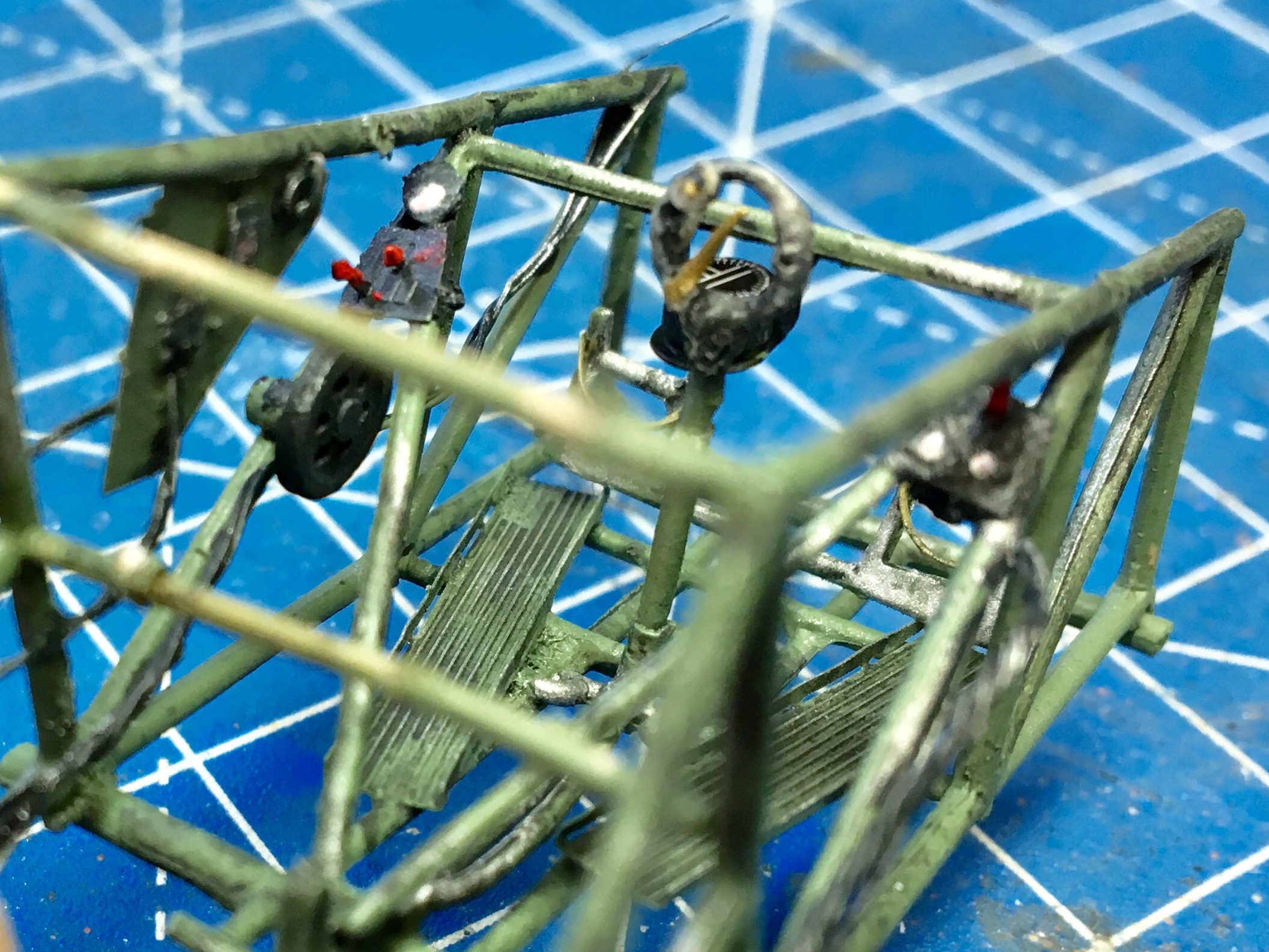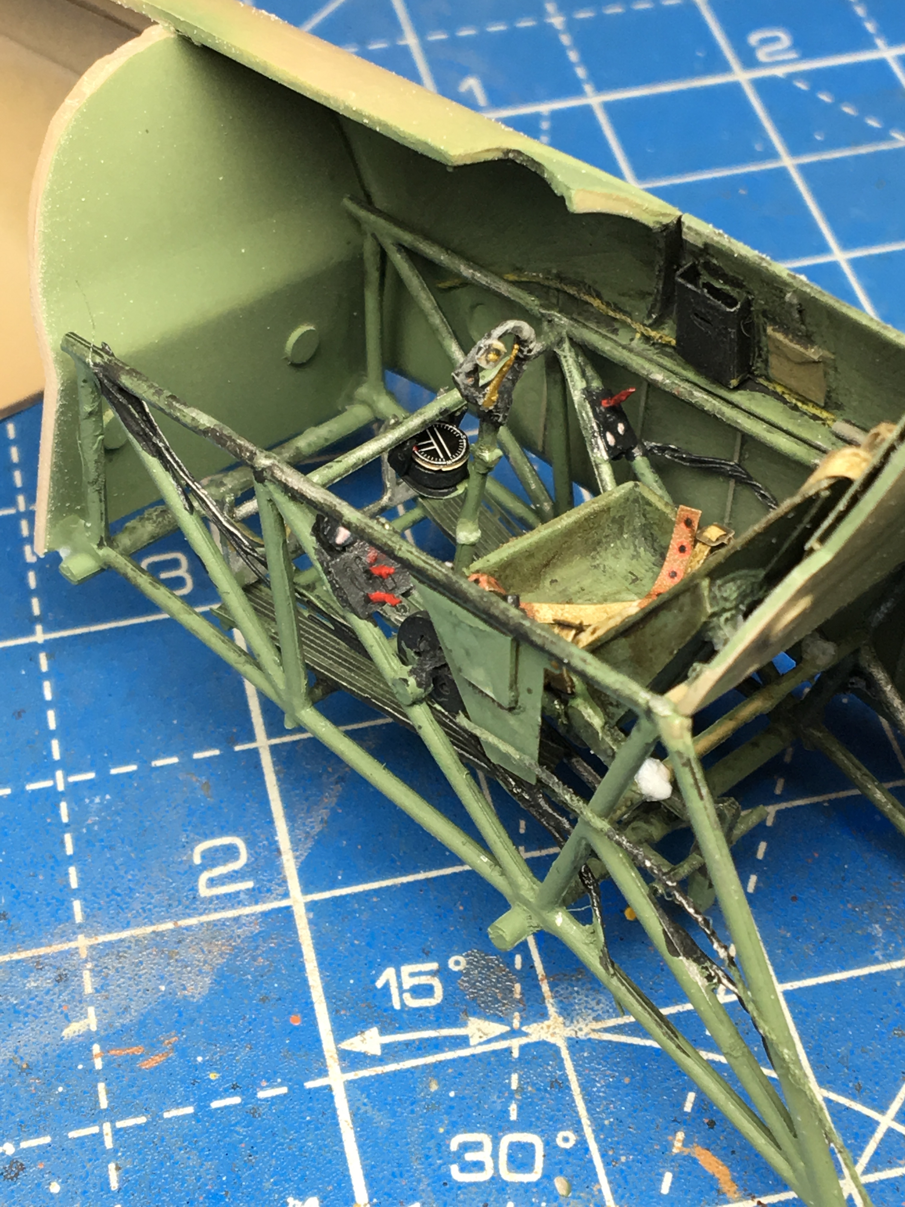 Work commenced on the cockpit and it’s tubular tub framing was the “glue” that had to hold it together. I took the kit parts and enhanced them with the UHU instrument panel and the HGW fabric seat harness. With some careful detail painting and weathering, the finished cockpit took on a well used look: