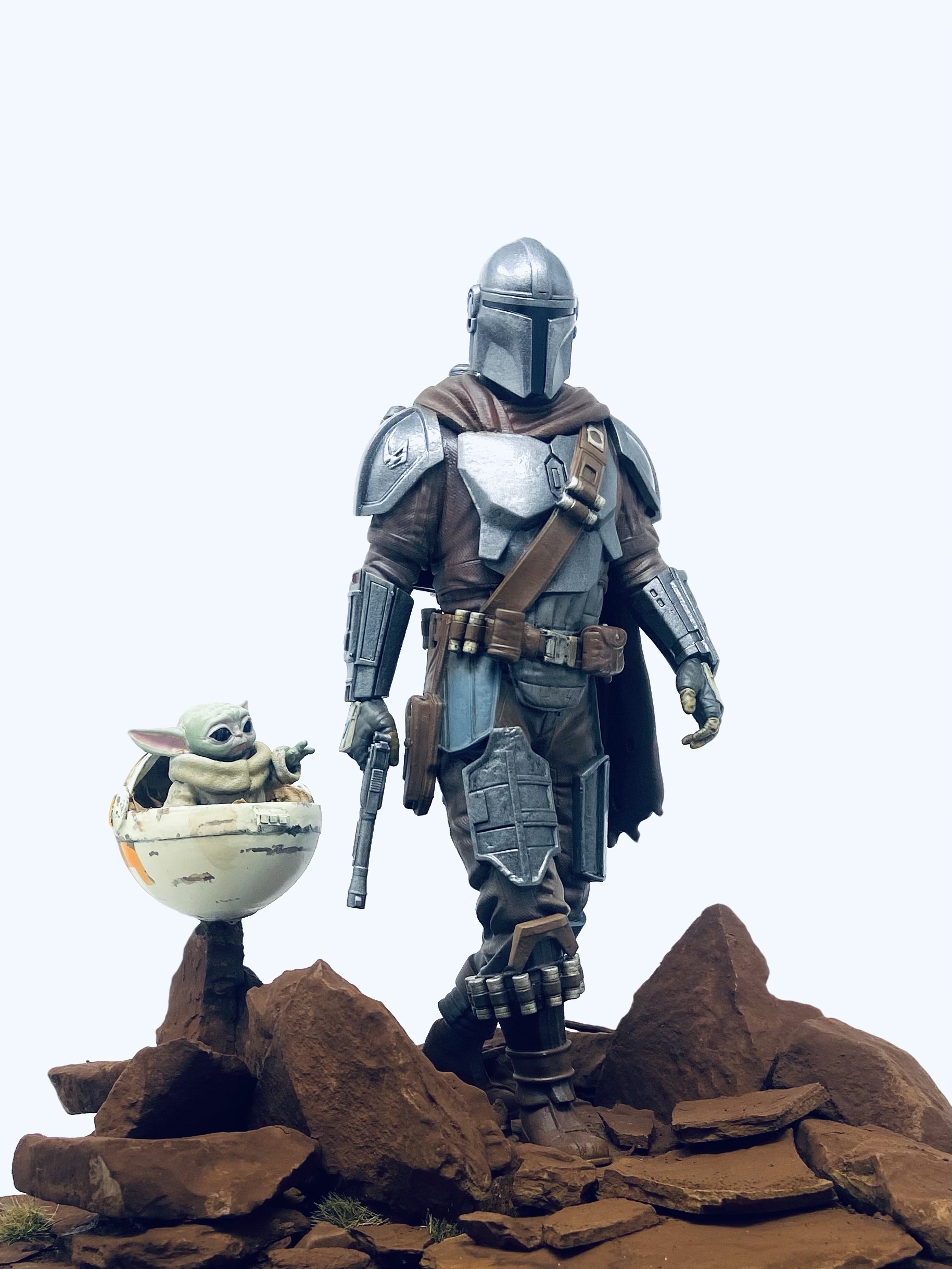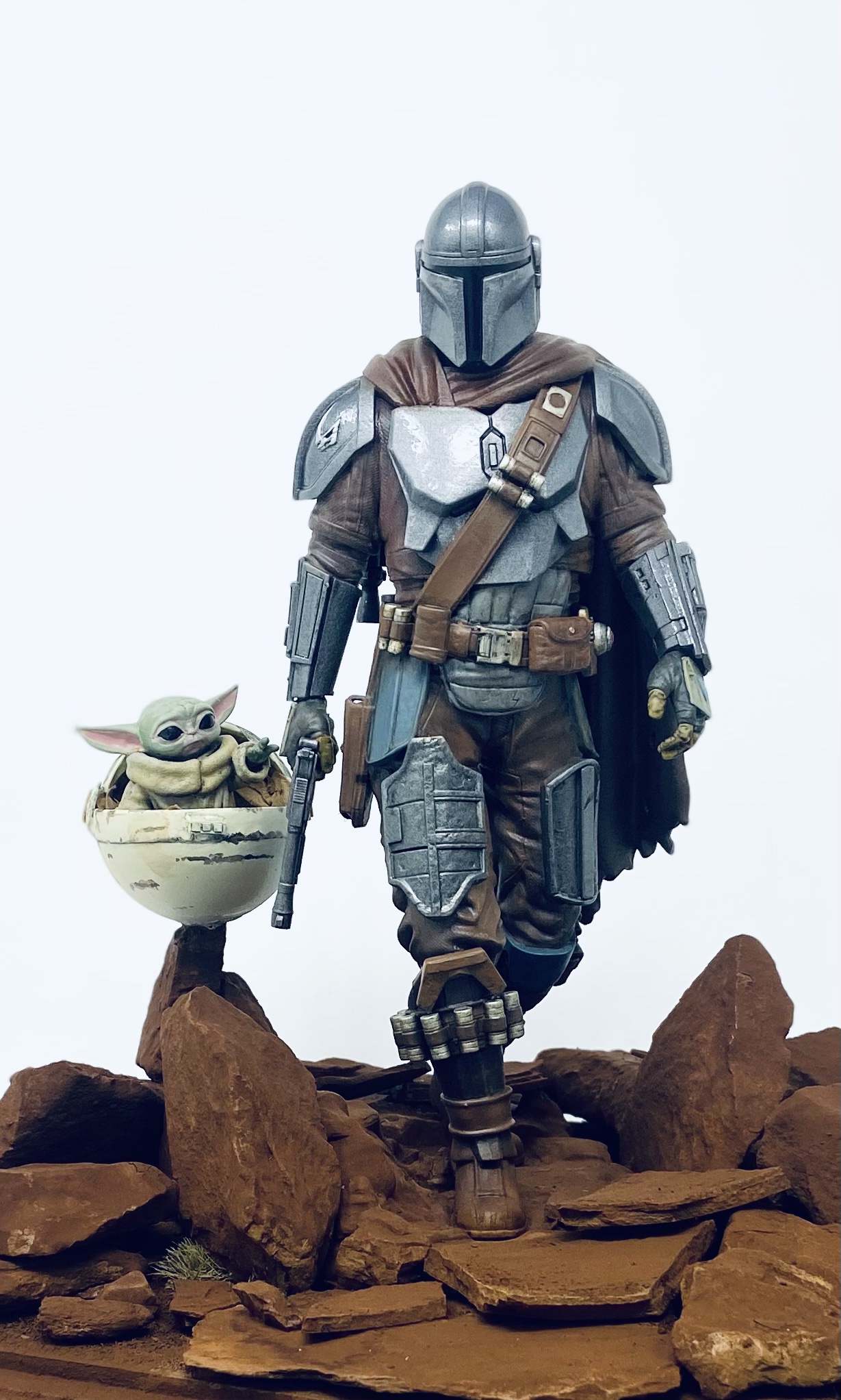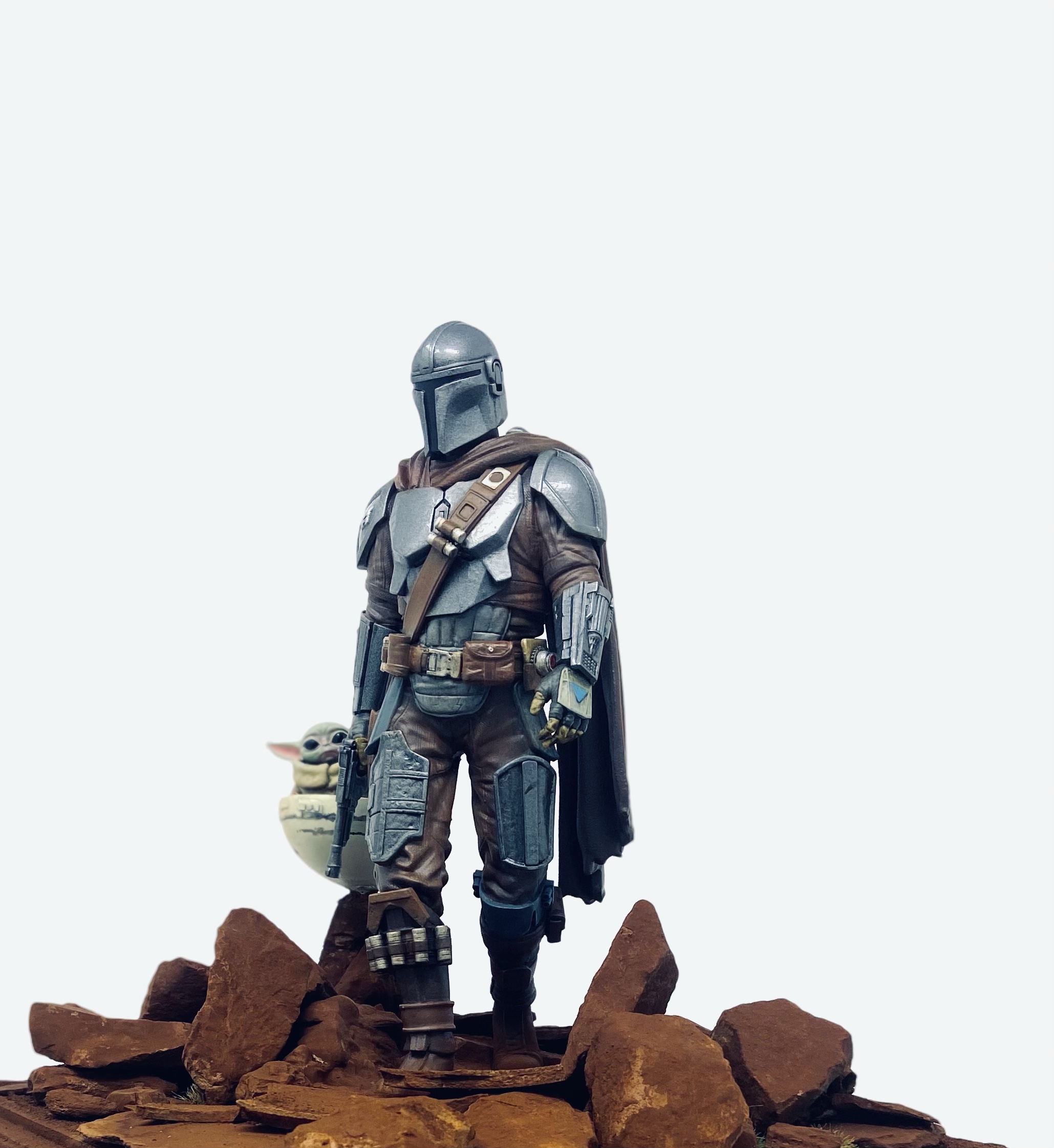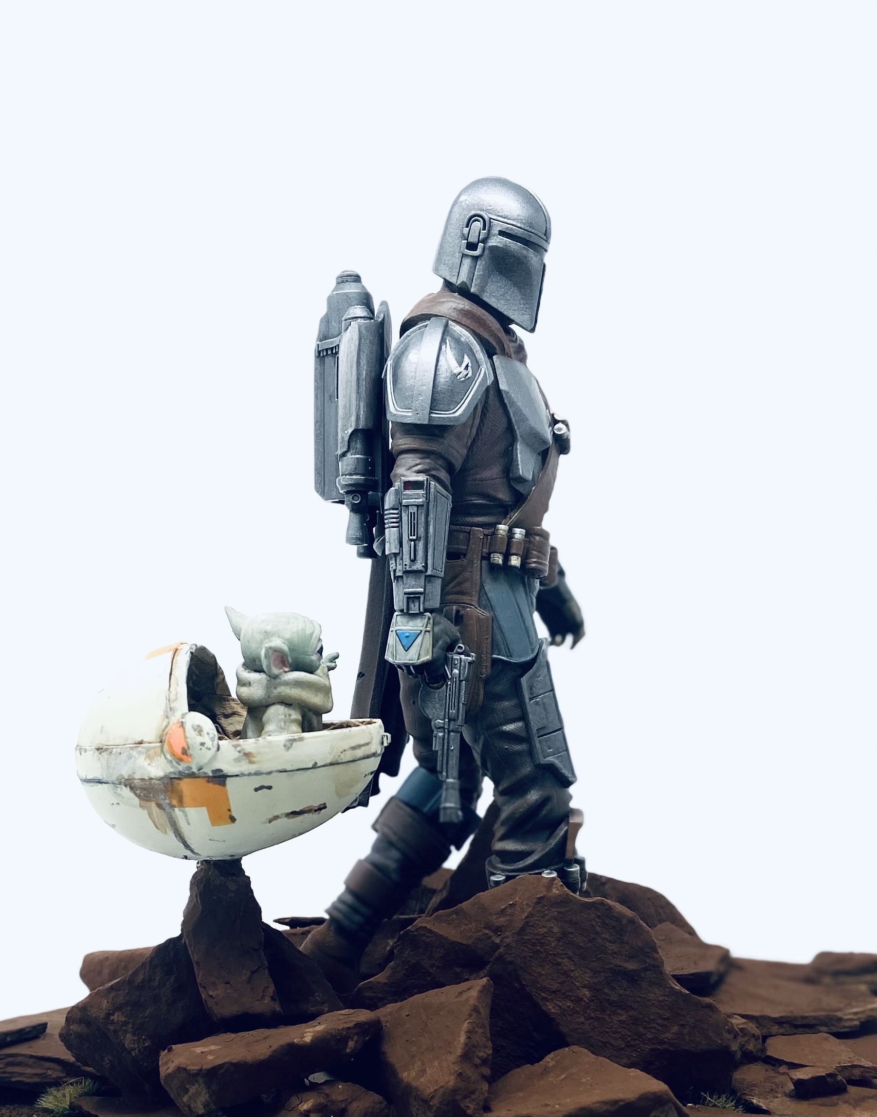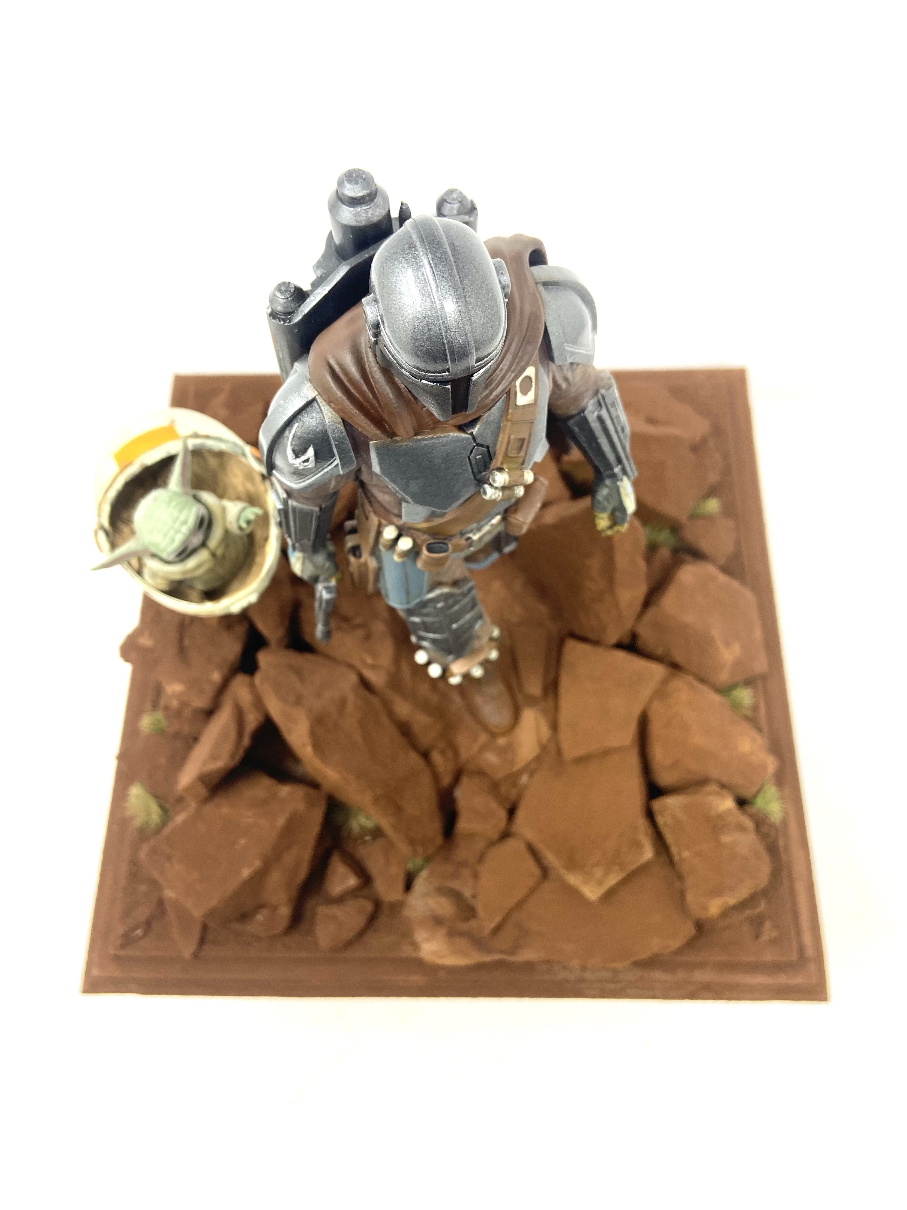 I painted the Mandarlorian armour in Alclad II metallics everything else was painted in Tamiya acrylics. In order to accomodate Grogu and his floating pram, I increased the footprint of the display base and used slate stones to make the groundwork look harsh and unforgiving. I painted the groundwork in tones of brown and I added rust pigments to add more texture.