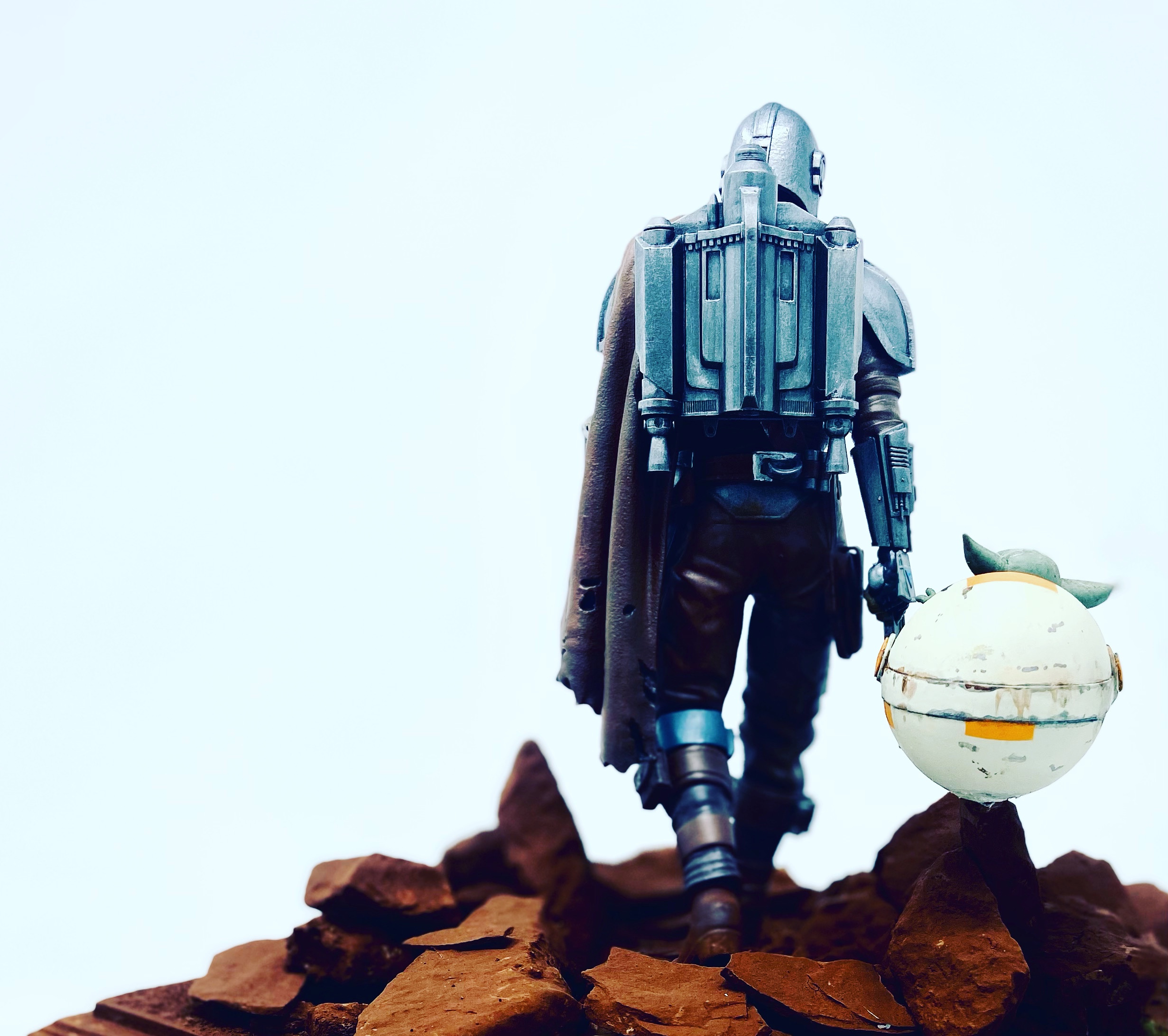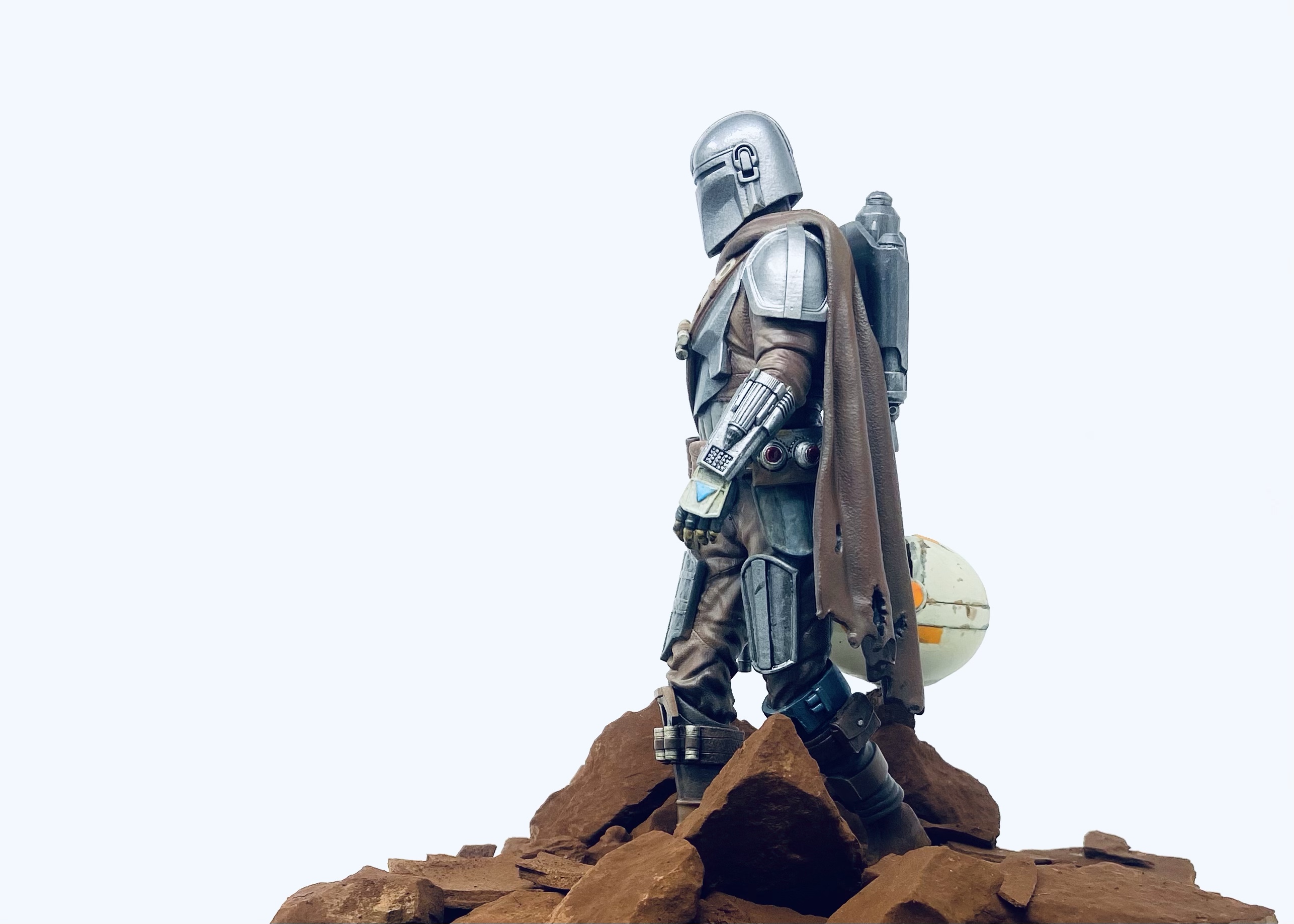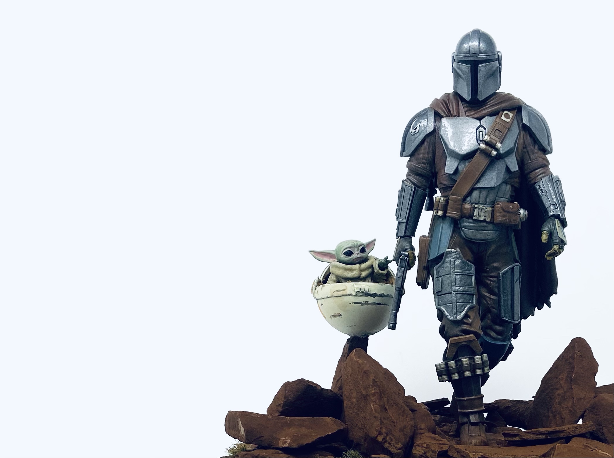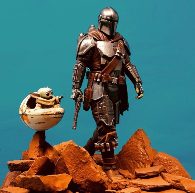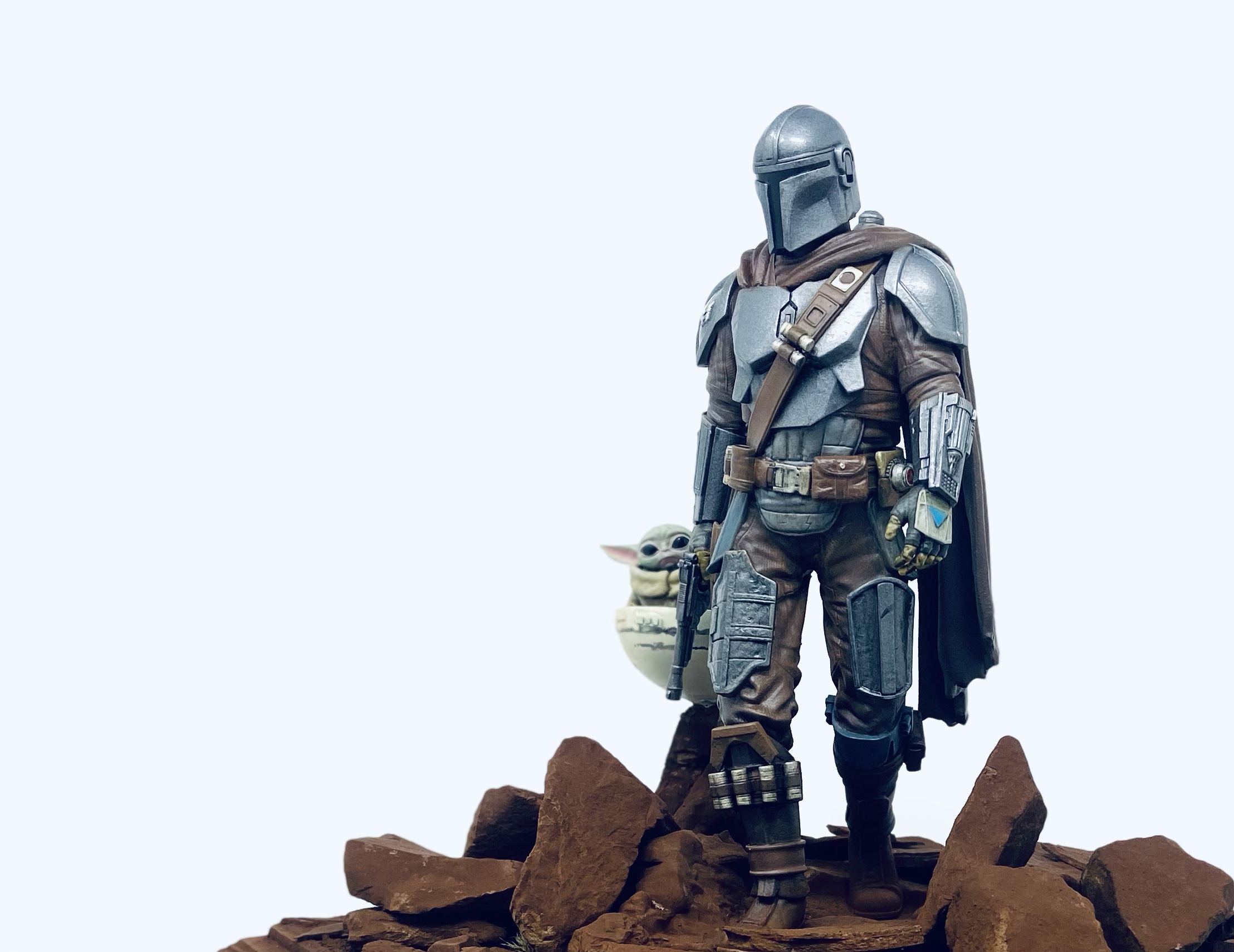 I painted the Mandarlorian armour in Alclad II metallics everything else was painted in Tamiya acrylics. In order to accomodate Grogu and his floating pram, I increased the footprint of the display base and used slate stones to make the groundwork look harsh and unforgiving. I painted the groundwork in tones of brown and I added rust pigments to add more texture.
