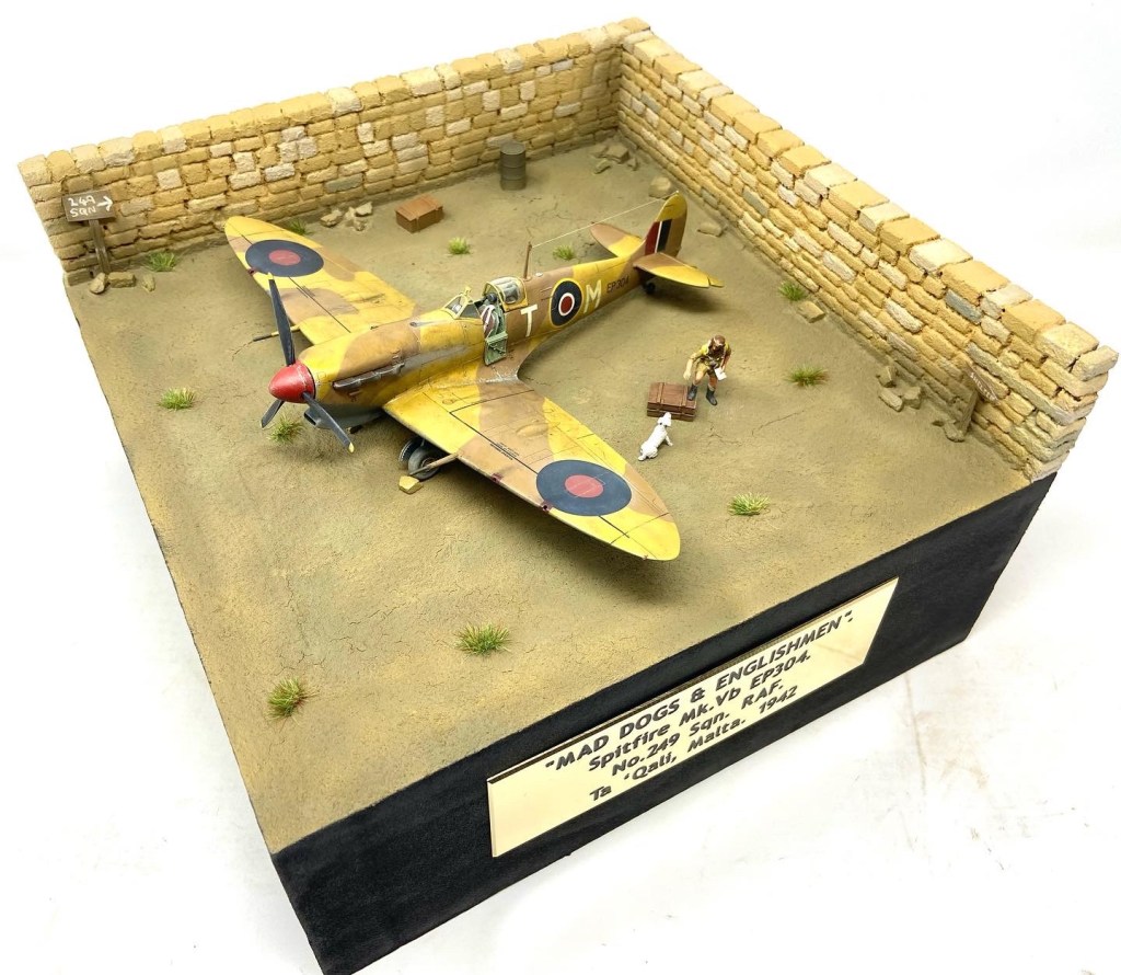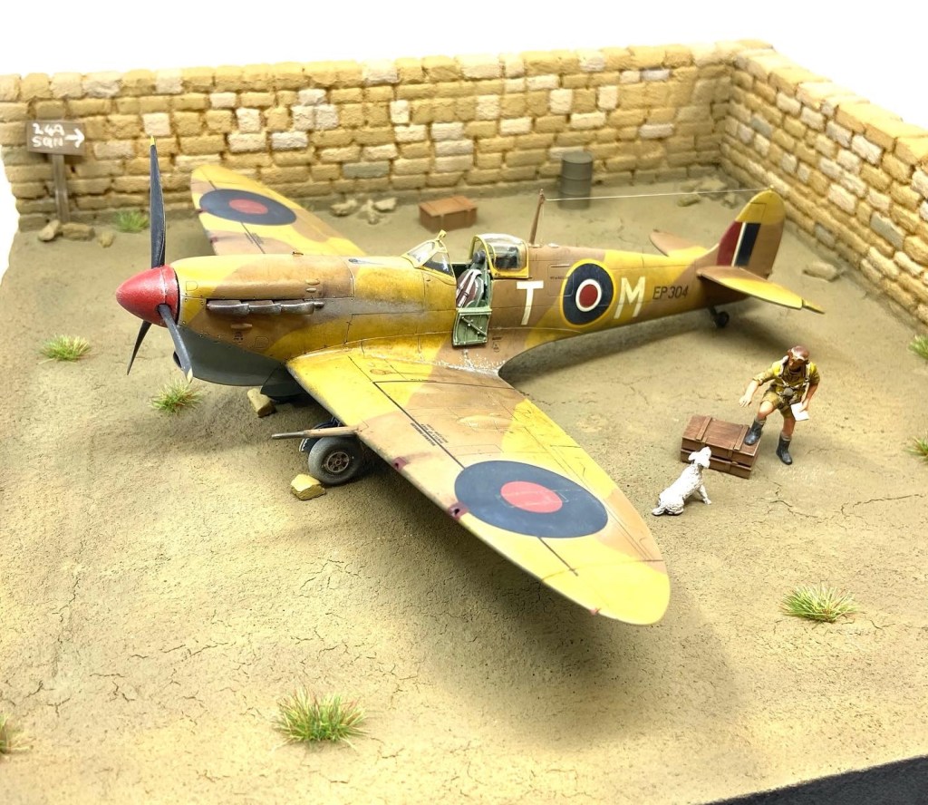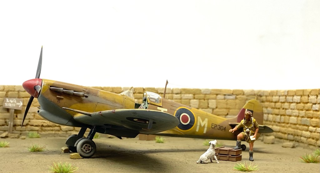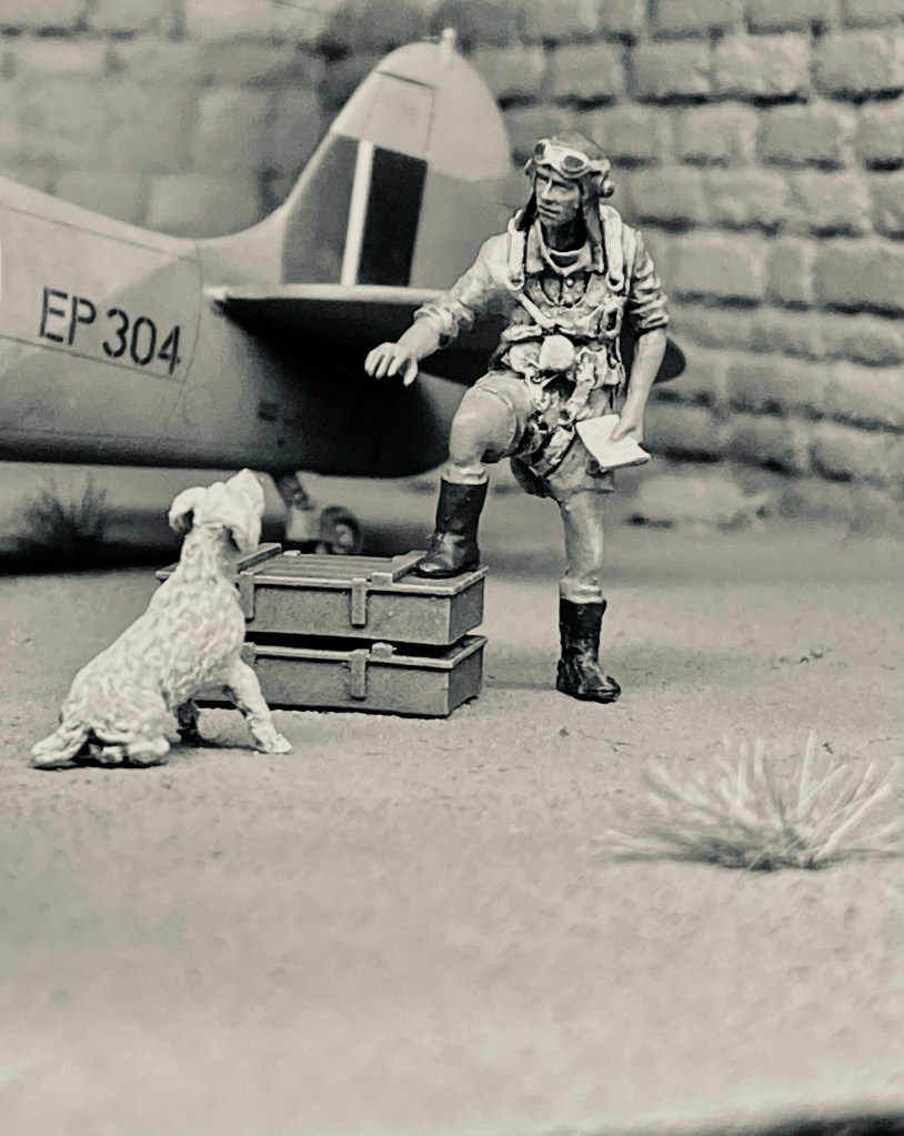 I made a simple display plinth from styrofoam. I also carved out a blast pen wall from styrofoam and I added various airfield accessories to set the scene. Just for fun, I added a resin RAF pilot and his dog. That’s when the title of this piece hit me…..