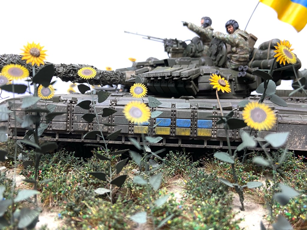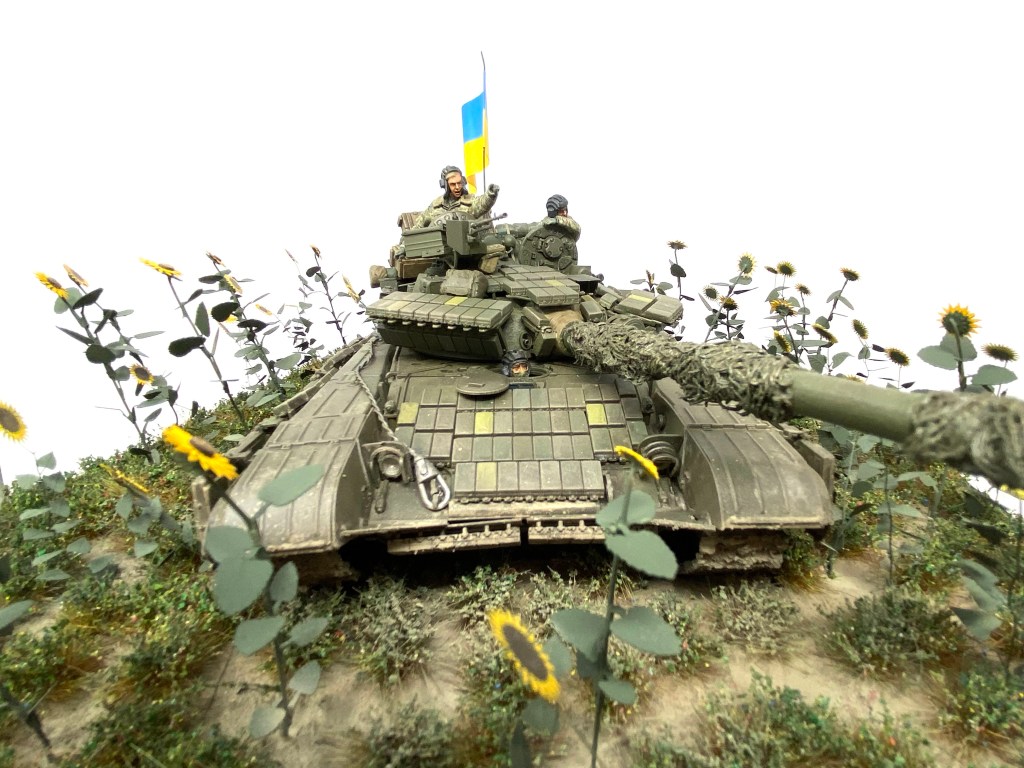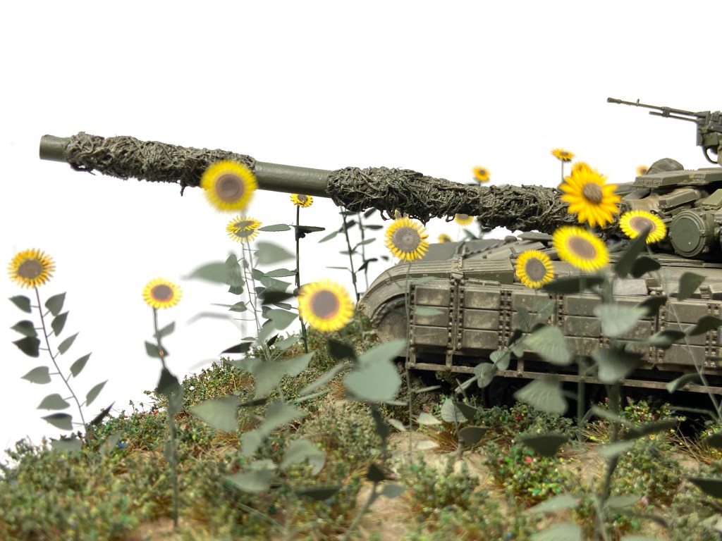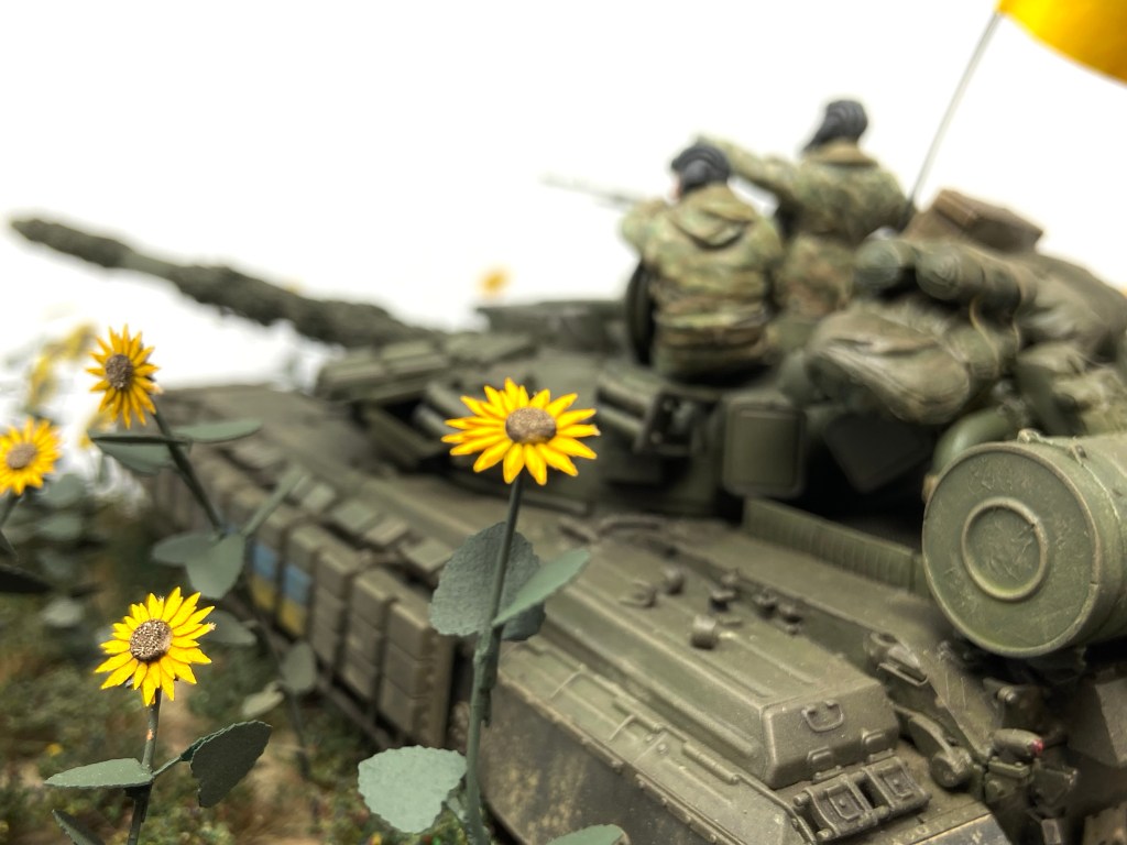 Here is my model, a 1/35 Trumpeter T-64BV in Ukraine markings on a homemade display with modified resin figures depicting a more scenic and gentle scene from this conflict-A Ukraine tank at rest in the middle of a sunflower field.