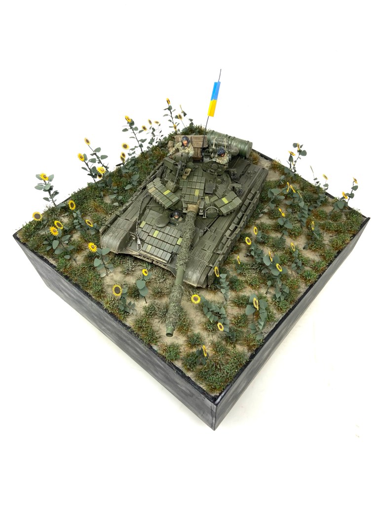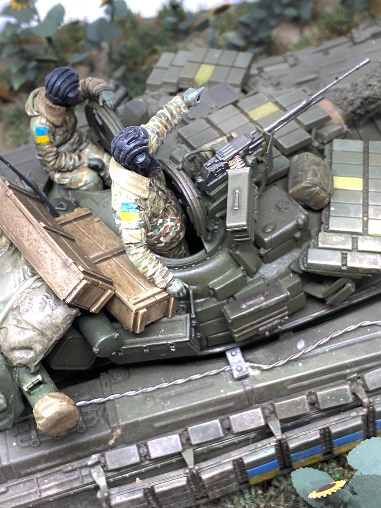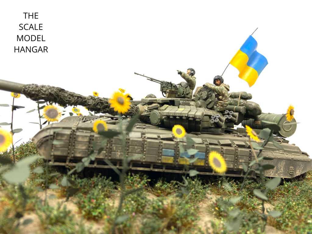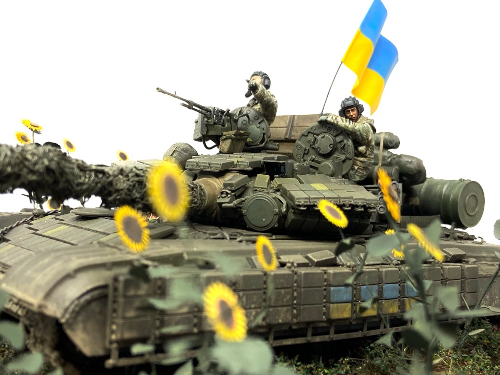 Here is my model, a 1/35 Trumpeter T-64BV in Ukraine markings on a homemade display with modified resin figures depicting a more scenic and gentle scene from this conflict-A Ukraine tank at rest in the middle of a sunflower field.