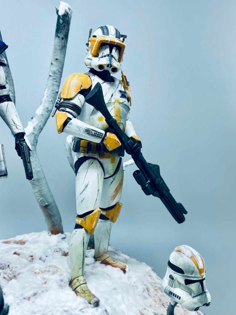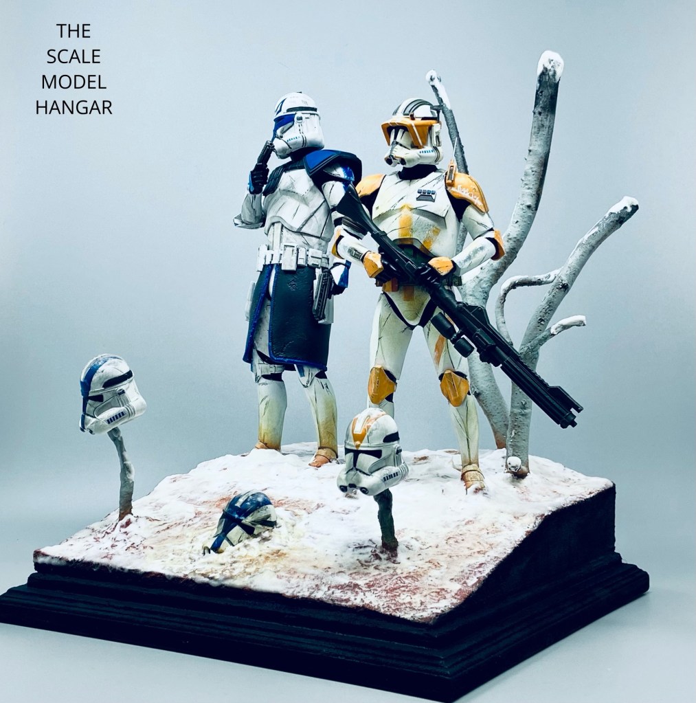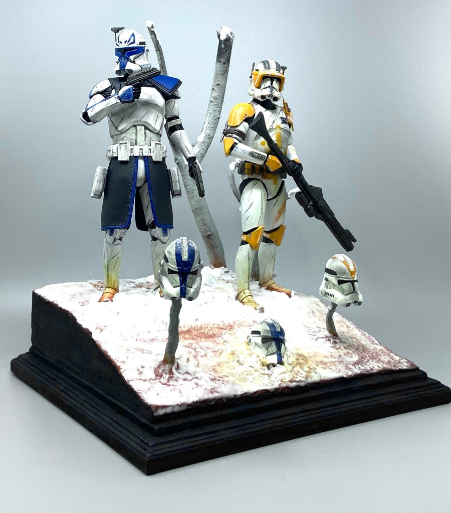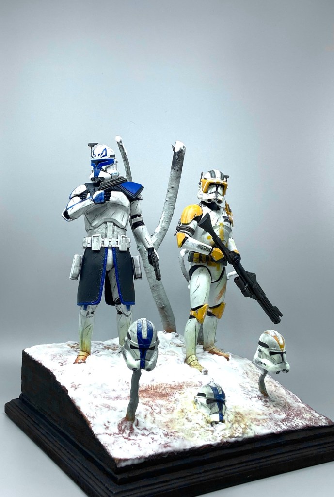 I have always admired Cody’s battle scared bright orange 212th Attack battalion armour and custom equipment, he is definitely my favourite Clone trooper character and by coincidence, Captain Rex is my son’s favourite Clone trooper character so I decided to make a vignette using both figures displayed on one base.