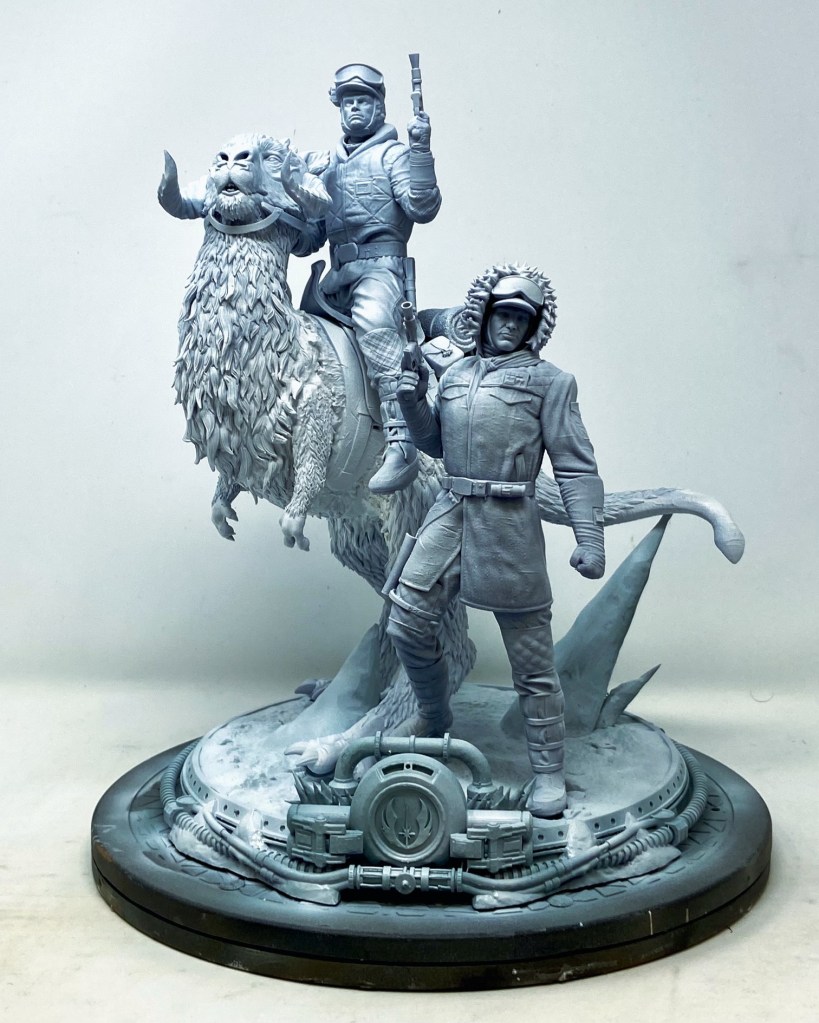 This 3d sculpture was nothing short of incredible! I cleared my workbench and set to work right away with great energy and enthusiasm. In shot order, the large scale Tauntaun, Luke and Han were assembled and ready for paint. I felt compelled to watch The Empire Strikes Back again to take notes about Luke and Han’s uniforms and the close up visual effects that brought Luke’s Tauntaun to life.