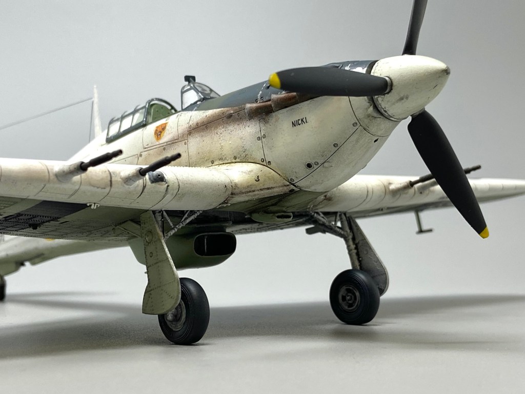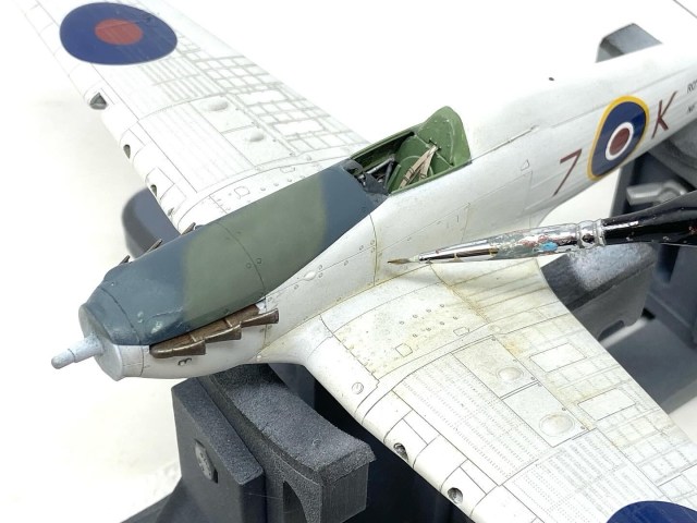 With the main assembly completed I could move on to the painting process. This consisted of my usual layering method starting with a base/primer coat of Tamiya NATO black acrylic. My second layer is a mottle coat of a warm brown shade that would add depth underneath the white upper camouflage scheme. The last white coat of paint was misted on in a few light layers to build up just enough opacity to make the paint appear slightly worn showing just a hint of the mottle coat underneath. Once the upper fuselage was finished, I masked the edges of the white camouflage and sprayed Tamiya Sky acrylic on the underside of the airframe. The last touches were to add the invasion stripes under the wings and the original anti-dazzle panel forward of the windscreen which retained its original camouflage. All the paintwork was then sealed in with a clear gloss coat to protect the paintwork prior to the decal process.