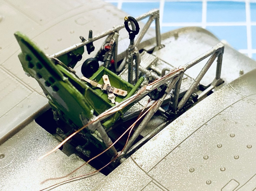 To get straight to it, I will say that this kit is very well tooled providing a lot of exterior surface detail and it builds up into a decent replica of the real aircraft. My only criticism of the kit, and the this down to my own personal taste more than anything else, is that the cockpit parts were quite flimsy in places which made assembly a little difficult. That said, the kit does provide 3d printed parts for the pilot seat and cannons which are a very welcome addition to this kit. Unfortunately I accidentally damaged these parts by my own clumsiness and had to settle with kit seat and a PE seat harness from Eduard. To make the cockpit interior look a little busier, I added copper wire to the side consoles.