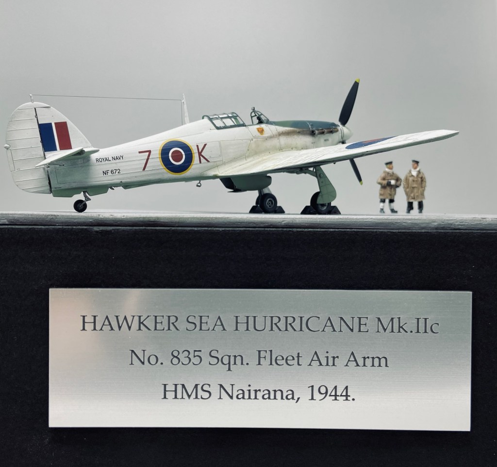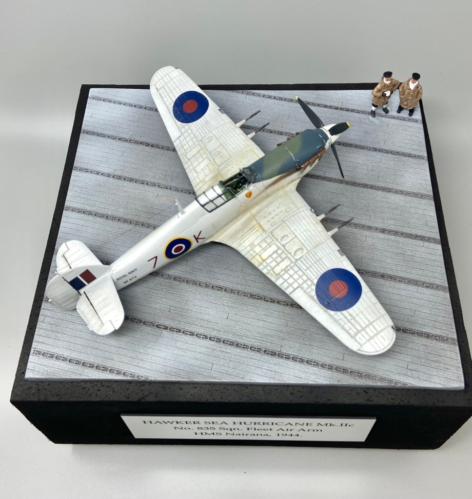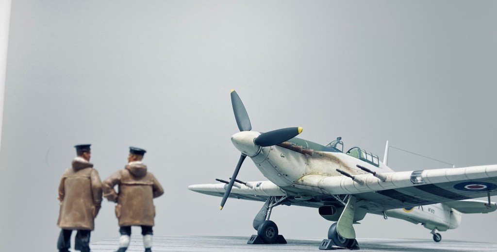 This model was a long awaited and greatly appreciated addition to my personal studio collection so I wanted to display it in a manner befitting its operational service. I purchased a resin wood carrier deck section and painted it in a blue/grey shade similar to those in in Royal Navy service at the time. This was mounted onto a black plinth cut from styrofoam and a plaque was attached to th front of the display. The last things to add were the 3d printed wheel chocks and two Royal Navy sailors. These metal figures came out of my spares box and I have no idea where they came from! Where’ve they did originate rom, they were the perfect figures to set the scene of the the Sea Hurricane being on deck during the harsh winter of the Atlantic campaign.