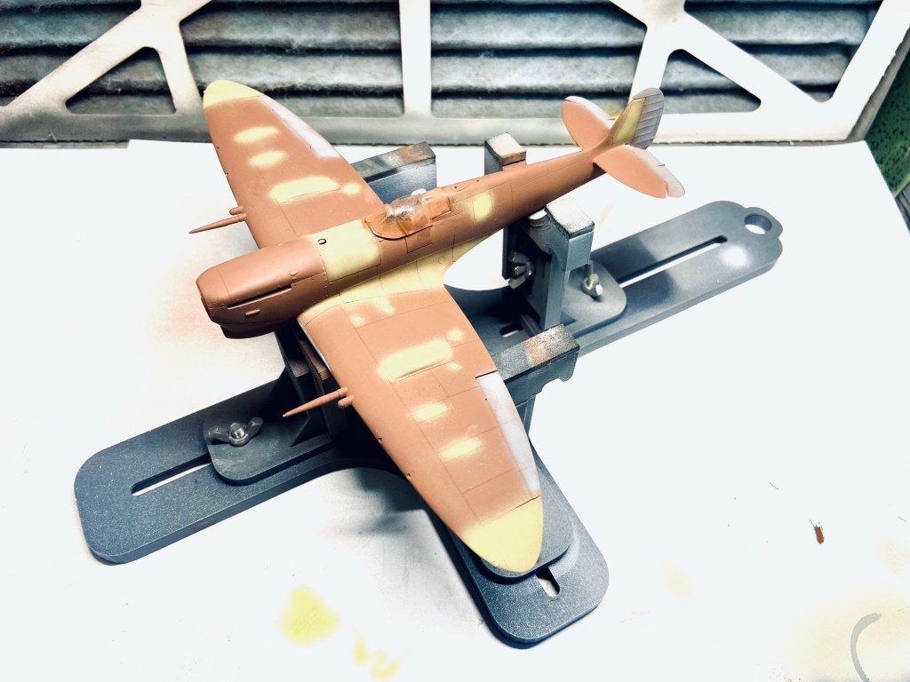 A lot of people ask me about my pre-shading technique and I always tell them each subject is different. In this case I am replicating the RAF tropical scheme applied during WWII. After the airframe had been checked for seams or blemishes on the surface I applied a primer coat of red-brown with an airbrush. Over this I singled out separate panels in yellow over the upper surfaces and I did the same with a grey shade on the underside. I then applied a mottle coat of yellow to the upper surfaces. the intent is to add shade underneath the camouflage colours to produce an appearance of depth to the paint. The process was repeated on then underside with various shades of grey and blue.