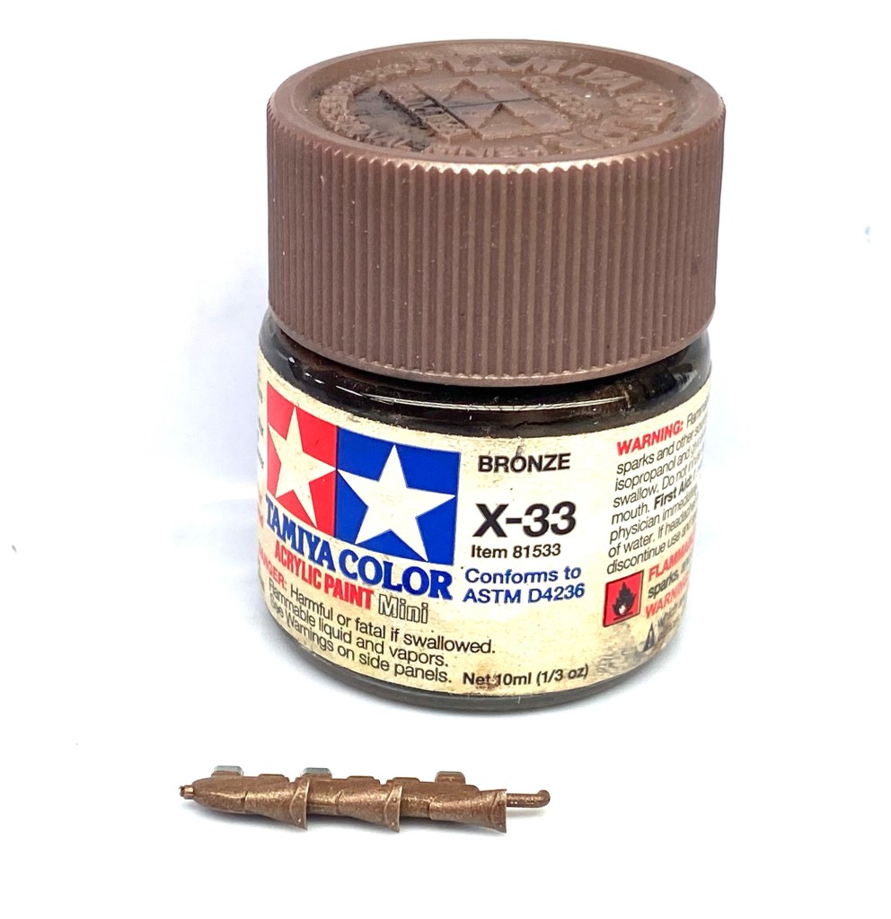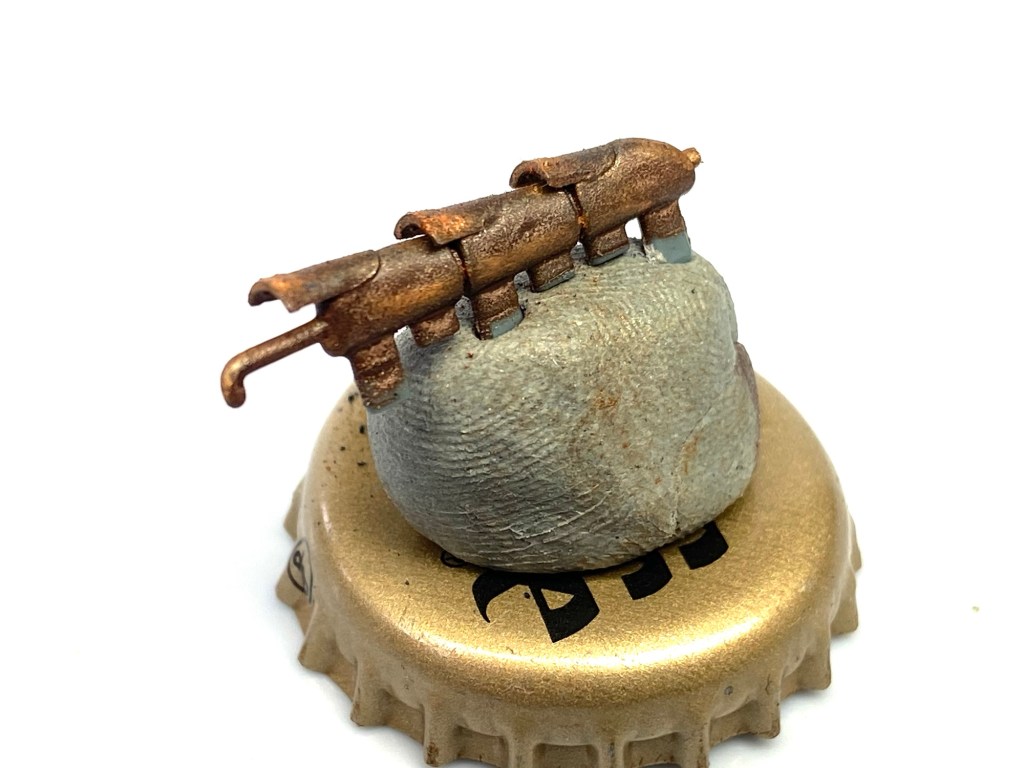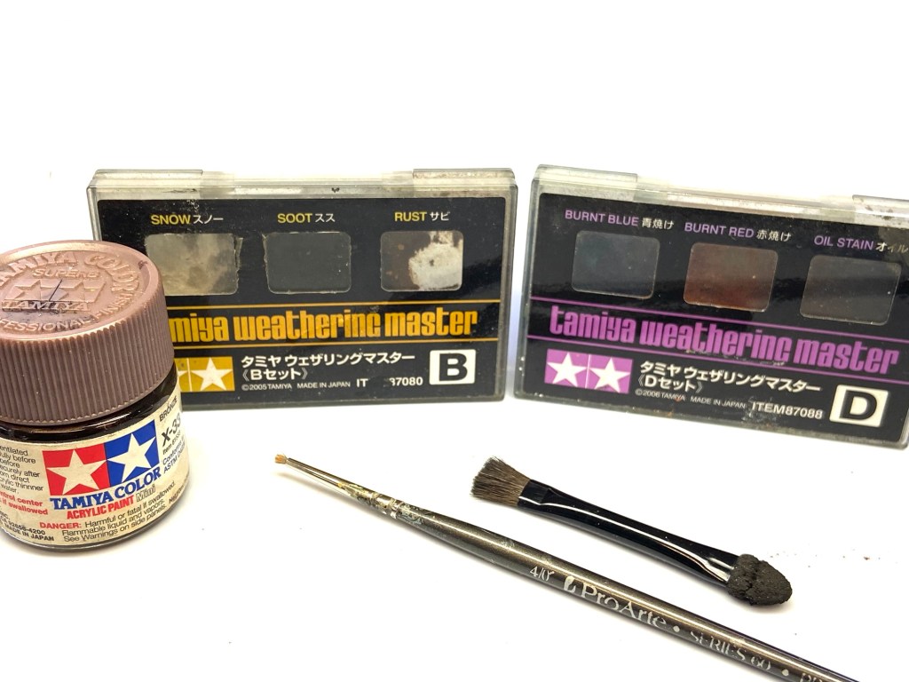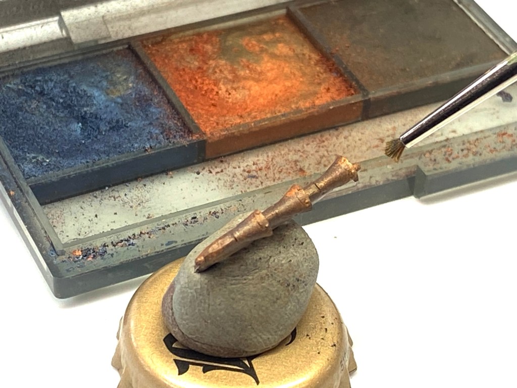 1. Paint the exhaust stacks with a Bronze metallic shade. Here I have used Tamiya acrylics X-33. Once dry, I use Tamiya Weathering Master set D to apply metallic reds and blues to give the impression of heat distortion. This needs to be gently dry brushed on. Eventually both shades should blend into the bronze paint to give a subtle effect. Lastly I add a little off white from Weathering Master set B to replicate the traces of burnt metal on the ends of the last two stacks on each side. The process can be followed with the photographs below.