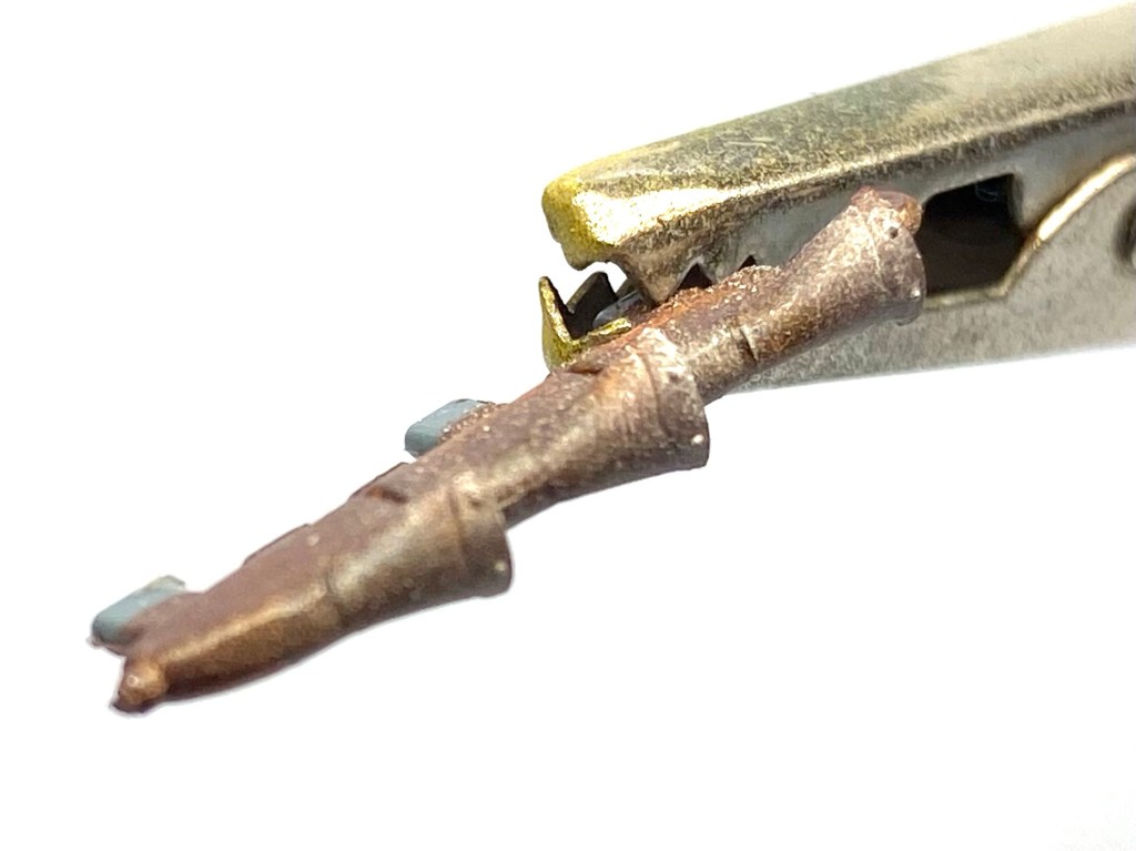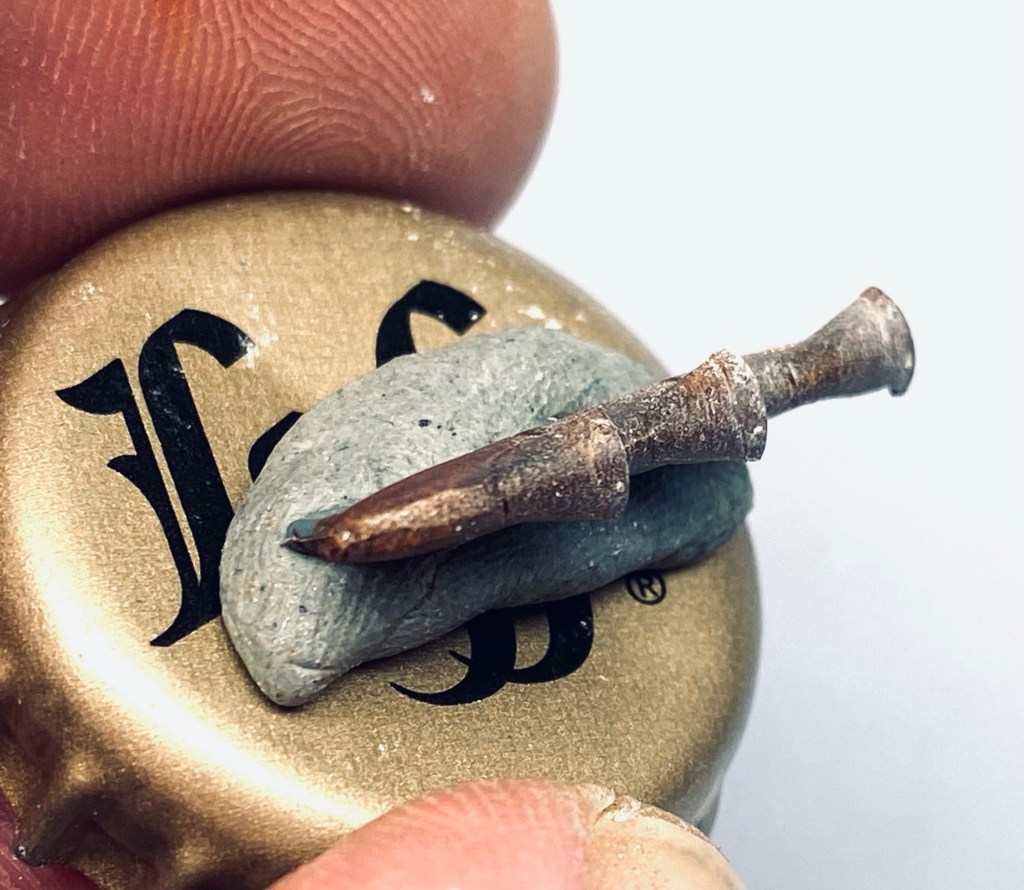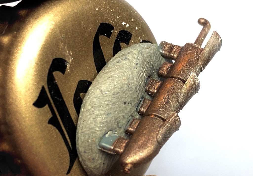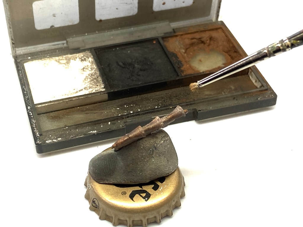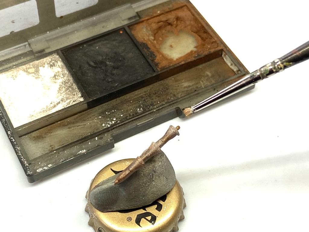 1. Paint the exhaust stacks with a Bronze metallic shade. Here I have used Tamiya acrylics X-33. Once dry, I use Tamiya Weathering Master set D to apply metallic reds and blues to give the impression of heat distortion. This needs to be gently dry brushed on. Eventually both shades should blend into the bronze paint to give a subtle effect. Lastly I add a little off white from Weathering Master set B to replicate the traces of burnt metal on the ends of the last two stacks on each side. The process can be followed with the photographs below.