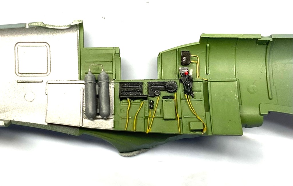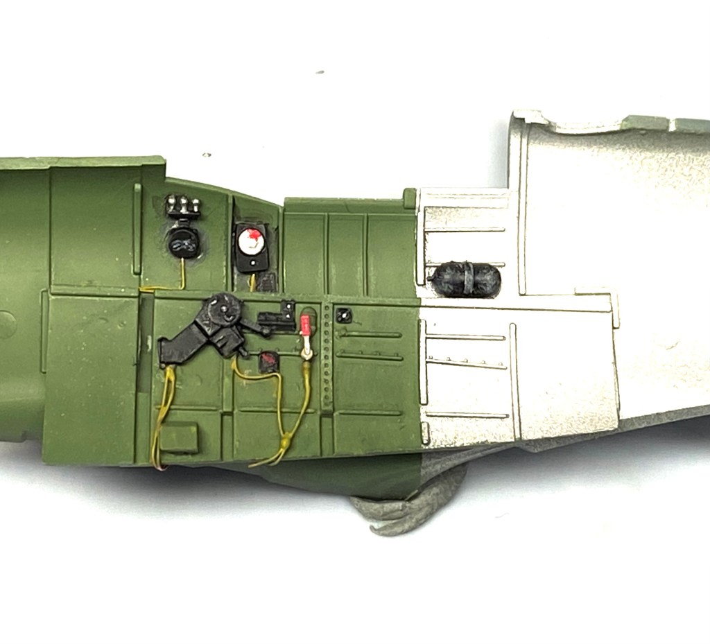As is the norm with aircraft models work commenced in the cockpit. I took the liberty of adding some extra detail in this area by drilling out lightening holes in the cockpit’s fuselage frames and adding some cables to give the “office” a busy look. The Eduard photo etch parts were easy to apply to the model and came pre-painted which saved me some time.